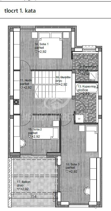 - Kat: hodnik, kupaonica s wc-om, tri spavaće sobe i balkon.