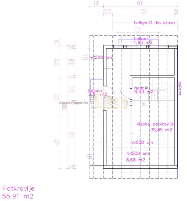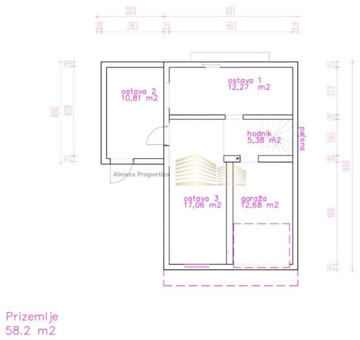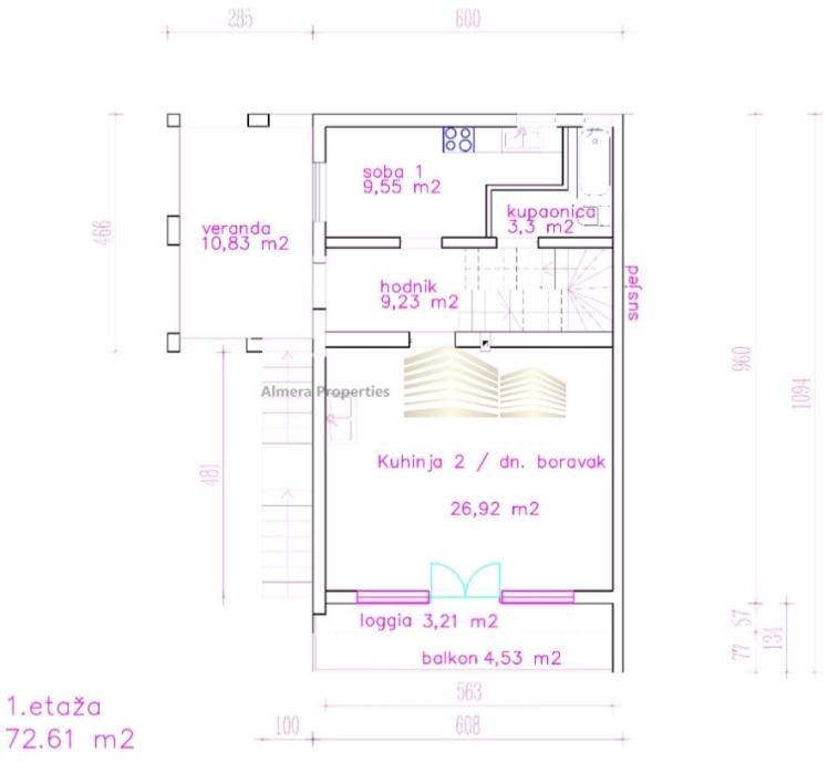 Prizemlje je površine 58,2 m², 1. etaža 72,61 m², 2. etaža 66,94 m² te visoko potkrovlje 55,91 m². Ukupna korisna neto površina na sve 4 etaže iznosi 253,66 m². Kad se uzmu u obzir koeficijenti za balkone, vanjsko stepenište i dio potkrovlja gdje je visina ispod 2m dobije se ukupna korisna površina 227,48 m². Iza kuće se nalazi vrt površine 123,94 m². Unutarnji raspored je moguće mijenjati rušenjem pregradnih zidova. Kuća u potresu nije imala nikakvih oštećenja.