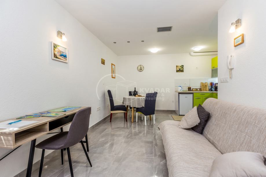 In an excellent location in Malinska, just 1 km from the sea and the town center, a functional and fully furnished 37 m2 apartment is for sale, situated on the semi-basement level of a smaller residential building (2 floors).