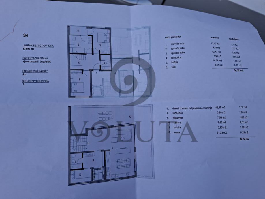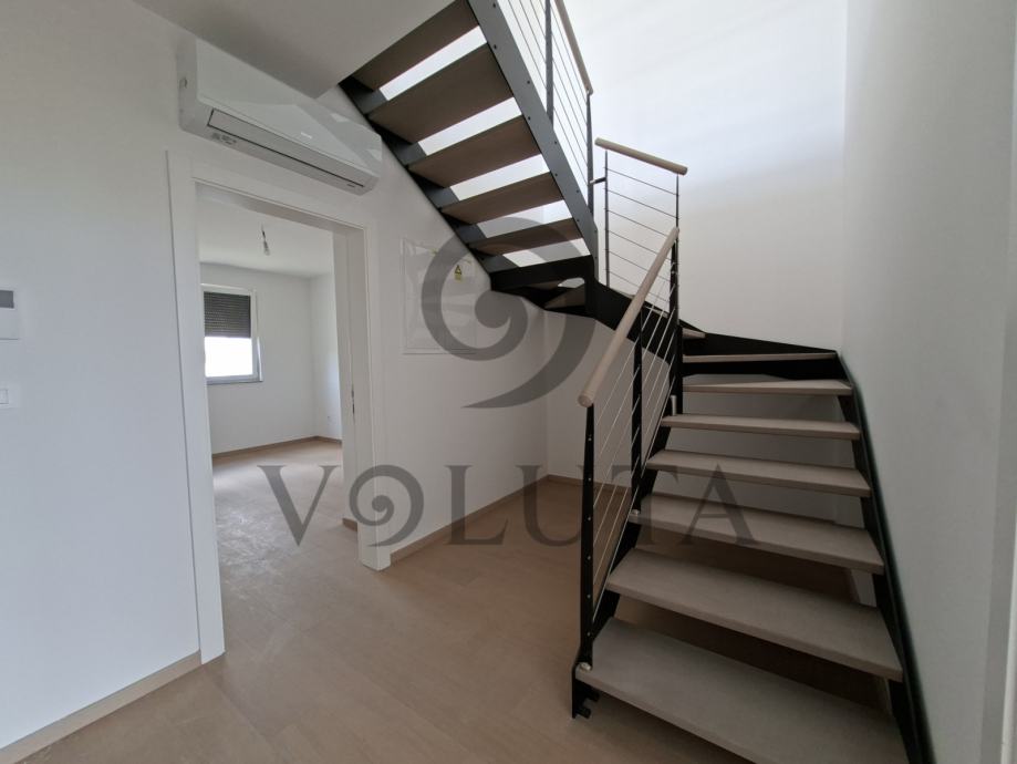 Ovaj predivan stan idealnog rasporeda sastoji se od tri spavaće sobe, kupaonice i lođe na prvoj etaži dok se na drugoj etaži nalazi toalet za goste, ostava, vešeraj, open space dnevni boravak s blagavaonicom i kuhinjom iz kojeg se izlazi na terasu sa spektakularnim panoramskim pogledom. Također, pripada mu i garaža, parkirno mjesto i spremište u prizemlju.