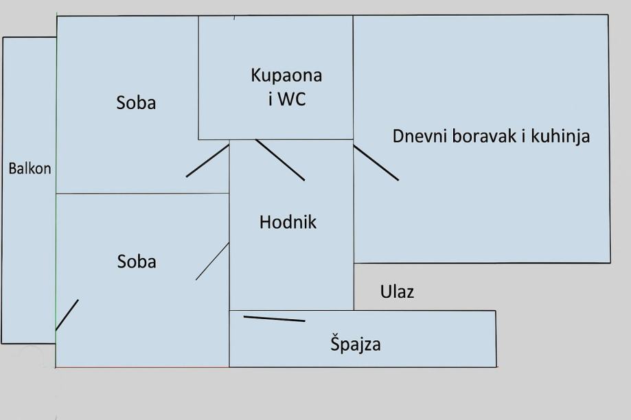 Sastoji se od ulaznog prostora, dvije spavaće sobe, dnevnog boravka s blagovaonicom i kuhinjom, kupaonice, balkona te ostave.