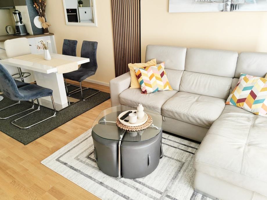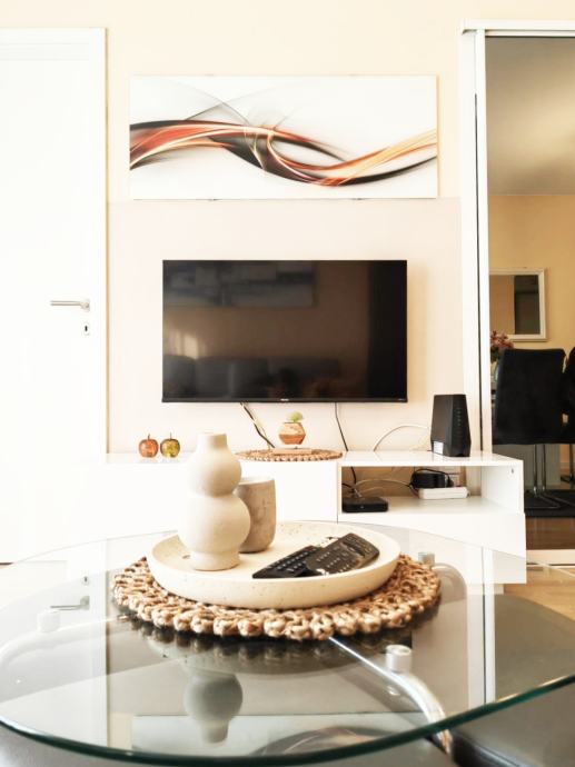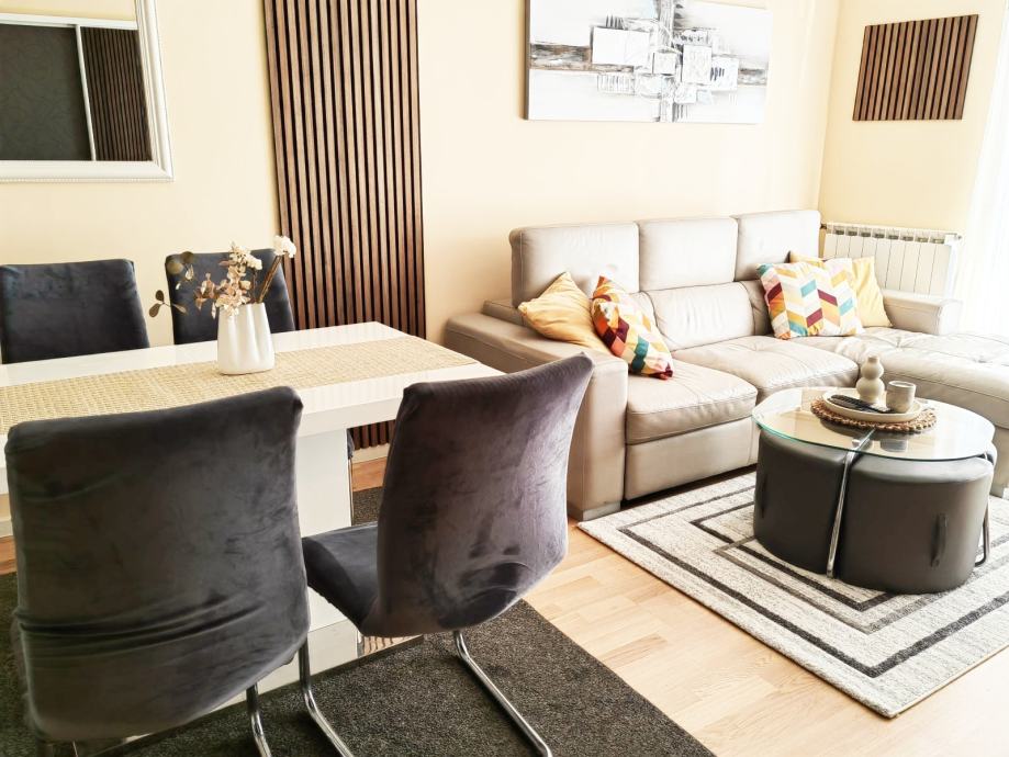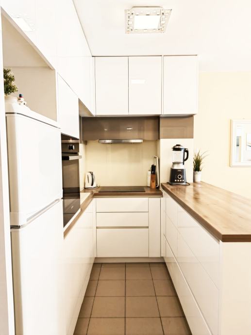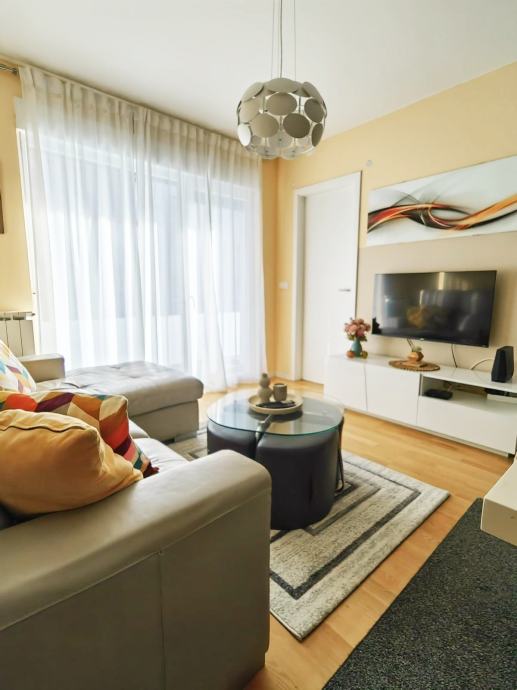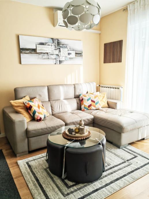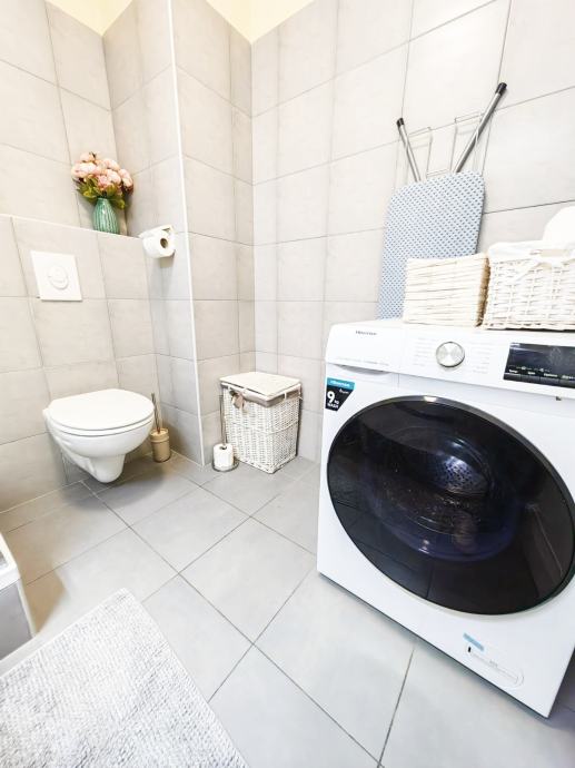 Stan je opremljen klima uređajem, wifi, smart TV, perilica suđa, perilica i susilica rublja, mikrovalna pećnica, kuhalo za vodu, električna ploča za kuhanje, pećnica, beštek, krpe, posteljina, ručnici...