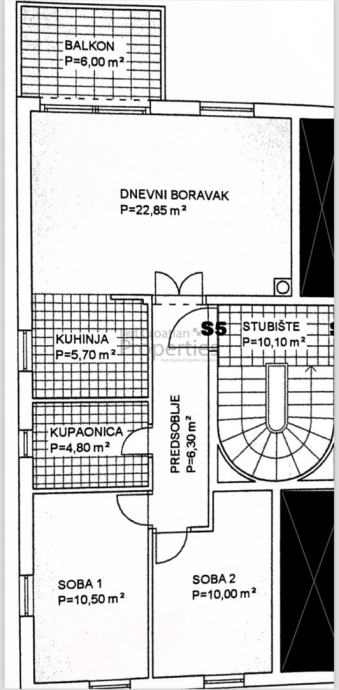 Stan ima 63.15m2 i sastoji se od ulaznog hodnika (6.30m2), dnevnog boravka s blagovaonicom(22.85m2) , kuhinje (5.70m2) , dvije spavaće sobe (10.50m2 i 10,00 m2) , kupaone s toaletom i tuš kabinom (4.80m2) i balkona (6m2).