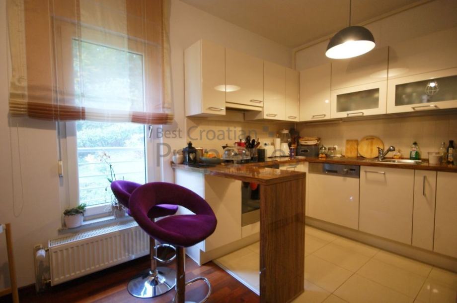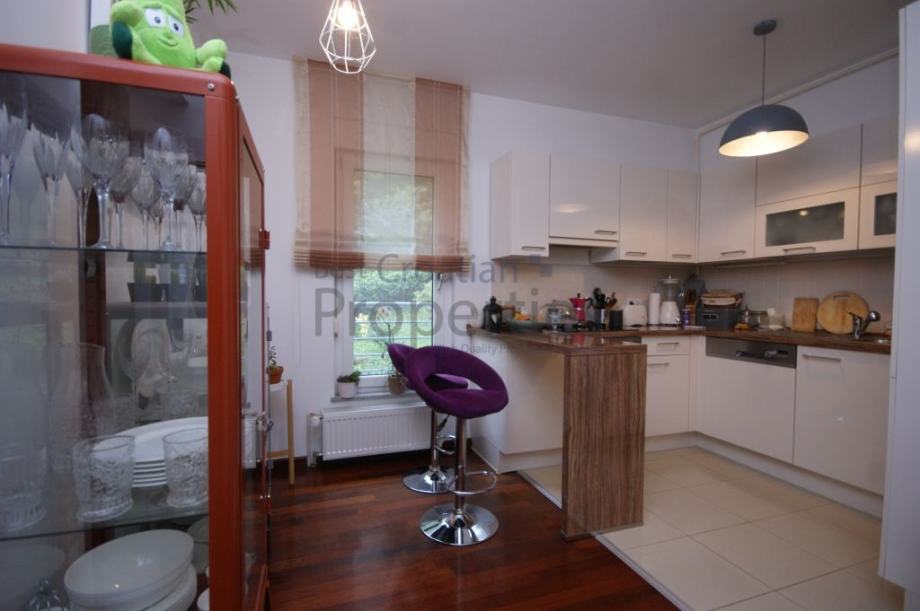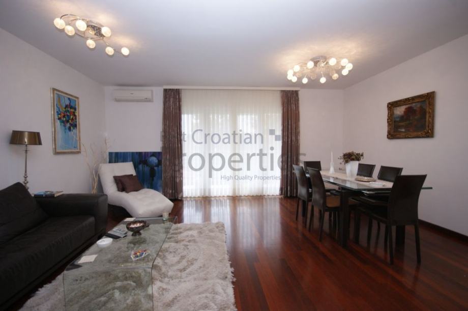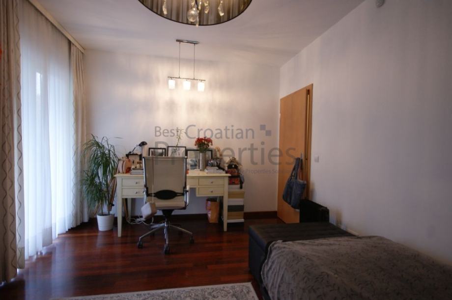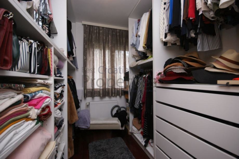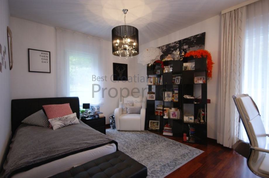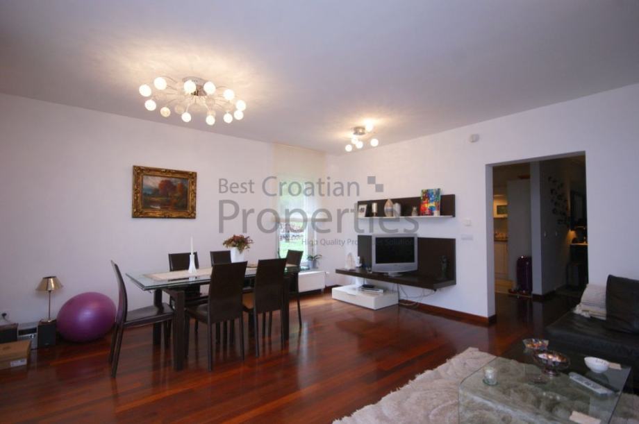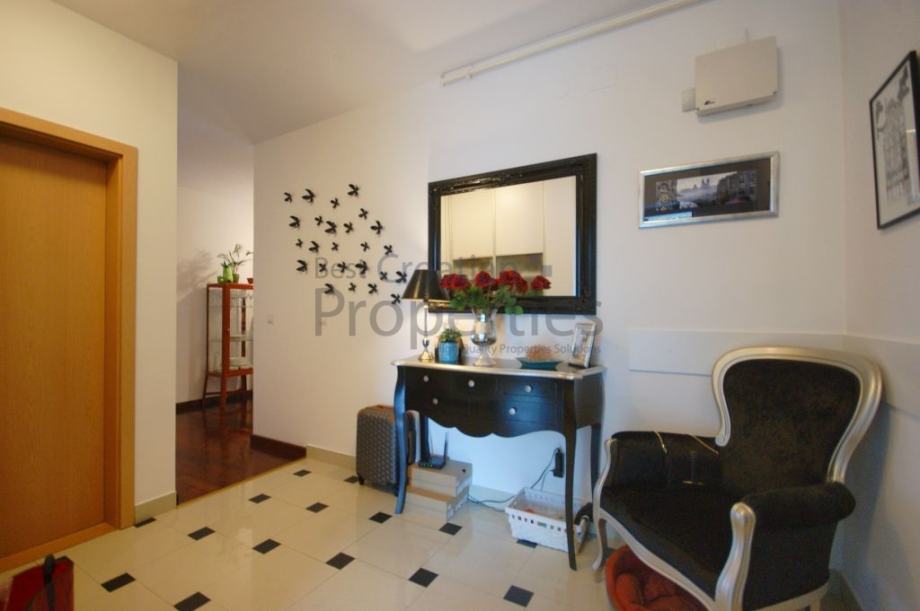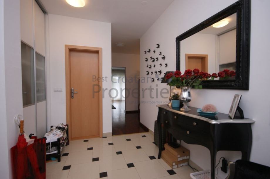 Stan se sastoji od prostranog dnevnog boravka s izlazom na natkriveni balkon, kuhinje, predsoblja, spavaće sobe s izlazom na terasu s koje se izlazi na vrt koji je u vlasništvu stana (cca 45 m2), dvije dječje sobe, prostrane kupaonice, zasebnog WC-a. Stanu pripadaju i dva parkirna mjesta u dvorištu zgrade.