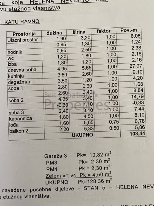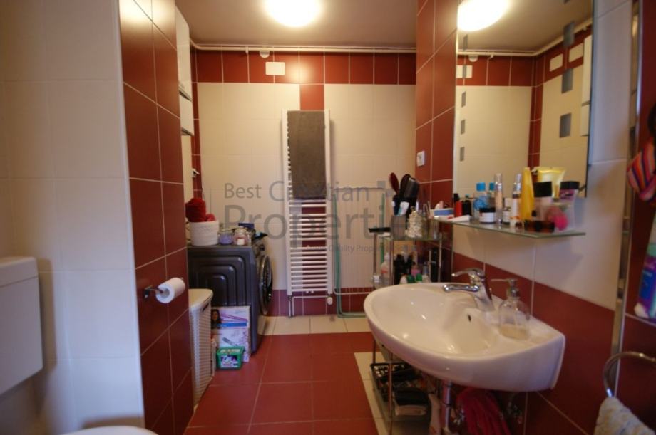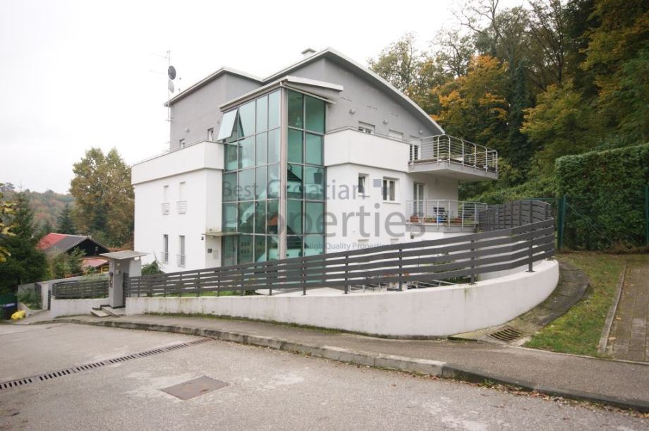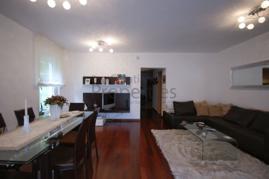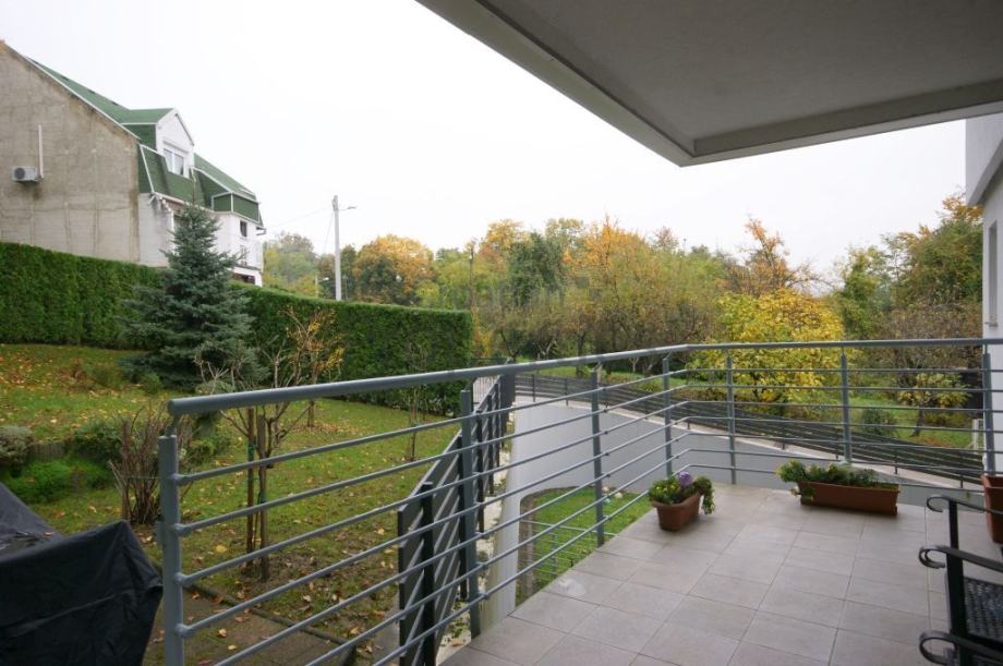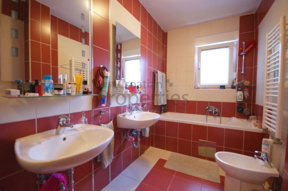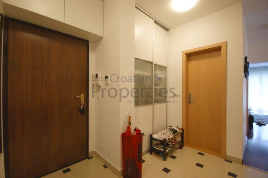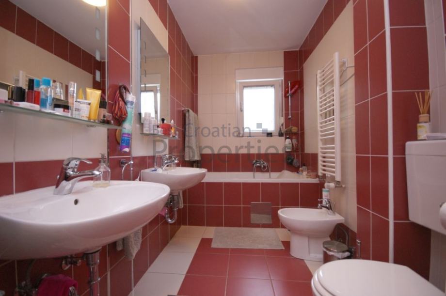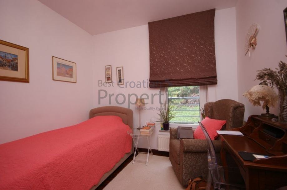 Stan se sastoji od prostranog dnevnog boravka s izlazom na natkriveni balkon, kuhinje, predsoblja, spavaće sobe s izlazom na terasu s koje se izlazi na vrt koji je u vlasništvu stana (cca 45 m2), dvije dječje sobe, prostrane kupaonice, zasebnog WC-a. Stanu pripadaju i dva parkirna mjesta u dvorištu zgrade.