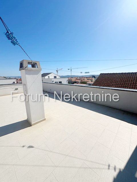 Stan je južno orijentiran s pogledom na more i otoke , izuzetno svijetao i sunčan . Ukupna površina prostora stana je 70m2 plus terasa 80m2., uz to spremište u podrumu i dva parkinga po 13m2 . Ukupna neto površina je 97,83m2 a u naravi bruto 150m2.