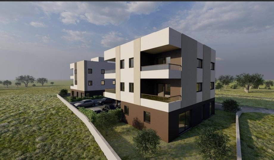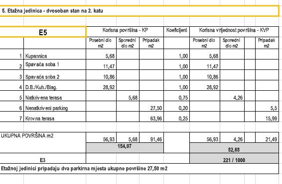 Bili Brig, novogradnja, u izgradnji je zgrada sa pet stambenih jedinica. Smještena u novom urbanom naselju u mirnom kvartu sa više novih manjih zgrada. Sastoji se od prizemlja, dva kata s izlazom na krovne terase. Krov je podijeljen na dvije krovne terase, te svakom stanu koji se nalazi na drugom katu pripada jedna odvojena krovna terasa. Za grijanje i hlađenje stanova postavljeni su klimatizacijski uređaji u dnevnom boravku i spavaćim sobama, podno grijanje je instalirano u kupaonici, no postoji opcija postavljanja i u cijelom stanu. U izgradnji i opremanju zgrade, koriste se suvremeni kvalitetni građevinski materijali i oprema. Izvođenje građevinskih radova je u tijeku, a predviđeni završetak radova i useljenje u stanove je do ljeta 2026. godine. Na 2. katu je na prodaju stan oznake S5 sa dvije spavaće sobe, krovnom terasom i dva parkirna mjesta, jedno natkriveno, drugo nenatkriveno. Stan se nalazi na drugom katu zgrade, zauzima pola etaže, a sastoji se od: - open space dnevnog boravka s kuhinjom i blagovaonicom (28,92 m2), - spavaće sobe (11,47 m2), - spavaće sobe (10,86 m2), - kupaonice (5,68 m2), i - natkrivene terase (5,68 m2). Unutarnji stambeni prostor zauzima površinu od 56,93 m2. Unutarnjim stubištem iz stana se može pristupiti prostranoj krovnoj terasi (63,96 m2), sa koje se pruža panoramski pogled na more, otoke i grad. Stanu pripadaju i 2 vanjska parkirna mjesta (2 x 13,75 m2), pa ukupna obračunska korisna vrijednost površine stana s pripadcima, iznosi 82,68 m2. KARAKTERISTIKE I OPREMA NEKRETNINE: = Konstrukcija zgrade / zidana - blok opeka = Termofasada / Stiropor 10 cm = Podne obloge - Parket u cijelom stanu osim kupaonice = Prvoklasna PVC stolarija / unutarnja boja bijela, vanjska boja bež = Ugrađeni komarnici = ALU rolete na elektropogon na svim prozorima i balkonskim stijenama = Ulazna vrata / protuprovalna - protupožarna = Klimatizacijski uređaj u dnevnom boravku i spavaćoj sobi = Podno grijanje u kupaonicama / Postoji opcija za postavljanje u cijelom stanu