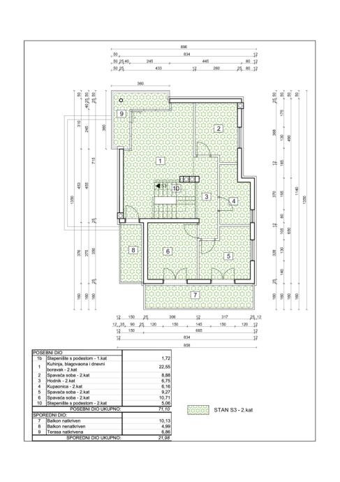 In short, it contains 71.10 m2 of internal space, 21.98 m2 in covered and uncovered balconies and covered terrace, and together with one parking space it provides 83.34 m2 of net living space with calculated coefficients at a price of €229,000.
