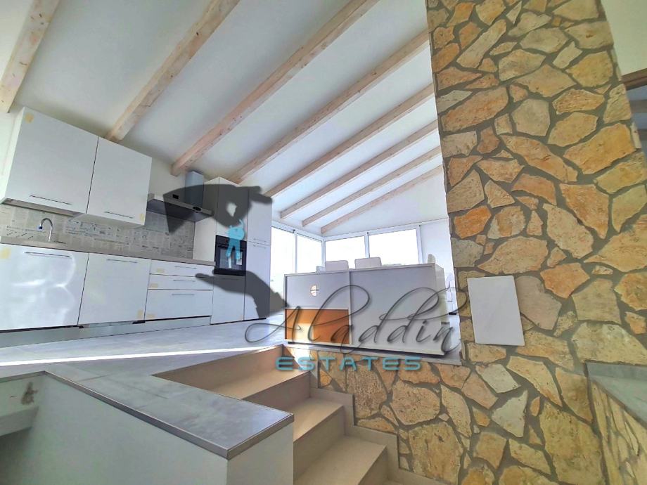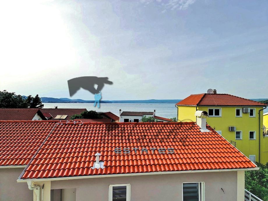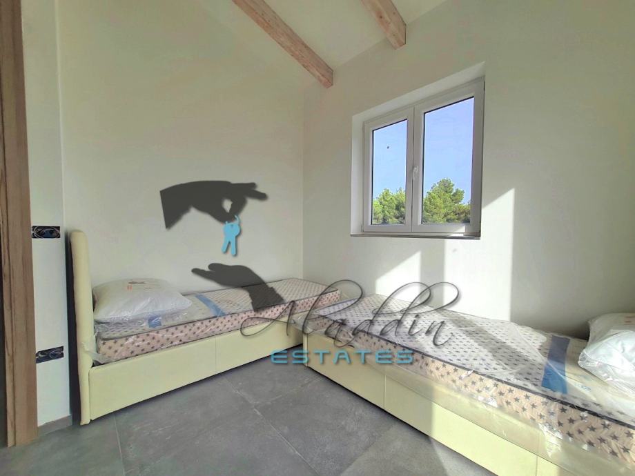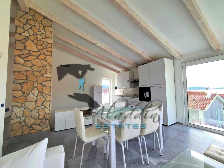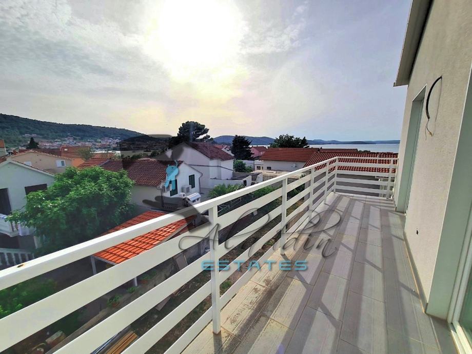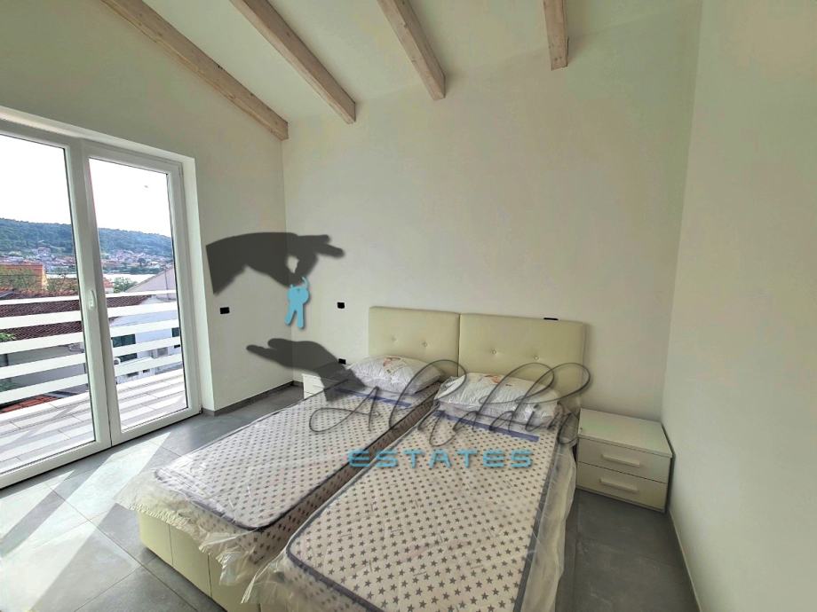 Three-story house newly built in Bilice near Šibenik, with one apartment on each floor. Availabe is penthouse apartment S3 on the second floor, which consists of living room, kitchen and dining room as one unit, three bedrooms, bathroom, hallway and staircase with landing. The apartment also includes covered and uncovered balcony, covered terrace and one outdoor parking space.