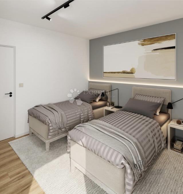 Ulazni hodnik (7,6 m2), kupaonica (4,5 m2), spavaća soba (12,3 m2), spavaća soba (12,3 m2) kuhinja s blagovaonicom i dnevnim boravkom (24,5 m2), te lođa (9,2 m2)