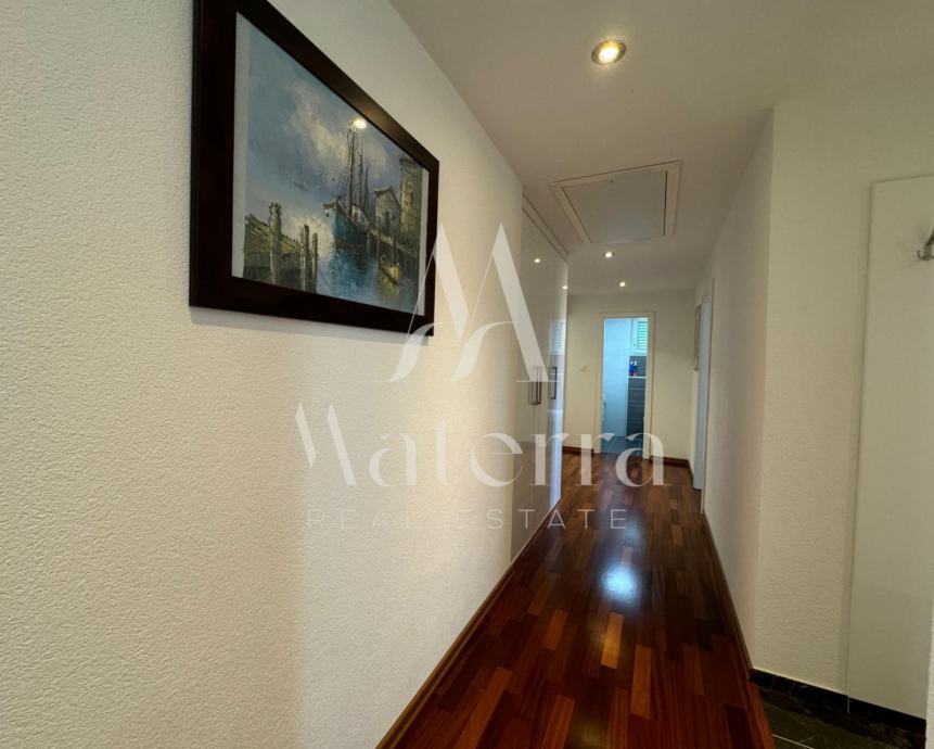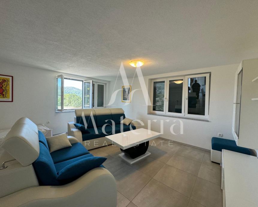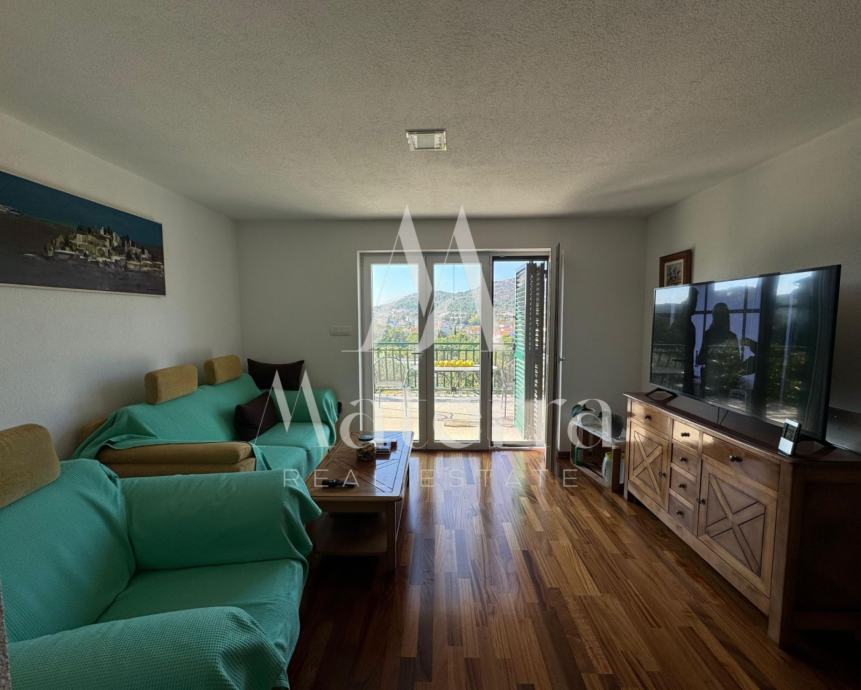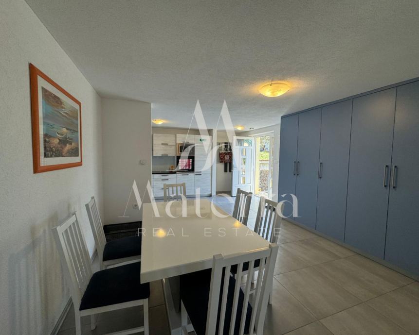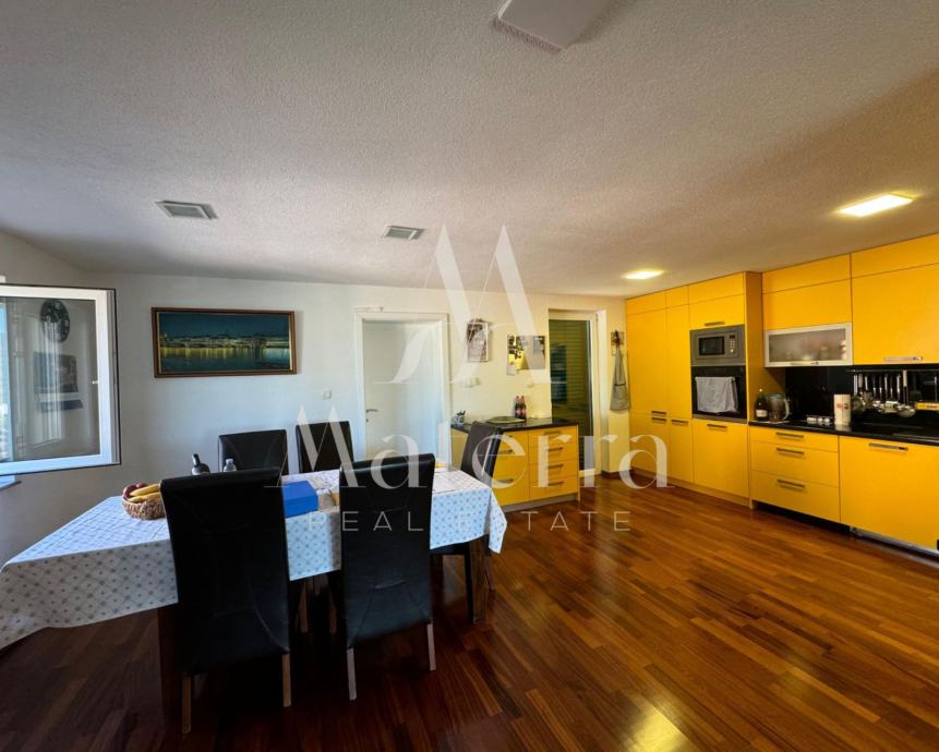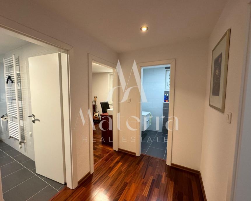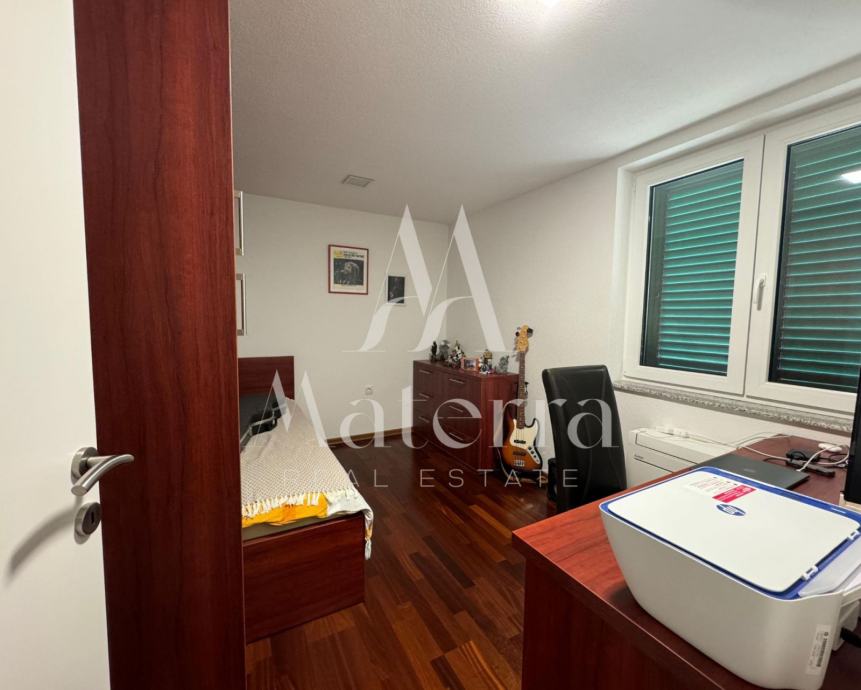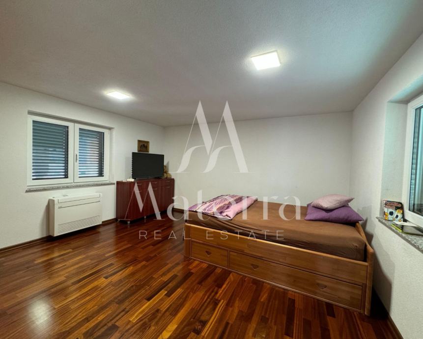 PRIZEMLJE/1.KAT: zasebnim vanjskim stepenicama se dolazi do 2. stana površine 135,13m2. Stan ima kuhinju, dnevni boravak, blagovaonicu otvorenog tlocrta površine 42,37m2. Stan se sastoji od 1 spavaće sobe površine 24,68m2, 2. spavaće sobe površine 19,67m2, 3. spavaće sobe površine 9,67m2. Stan ima jednu kupaonicu te jedan gostinjski WC. Stanu pripada vanjska terasa i stražnji dio okućnice gdje se nalazi roštilj. Kroz cijeli stan je postavljen prekrasni parket od mahagonija.