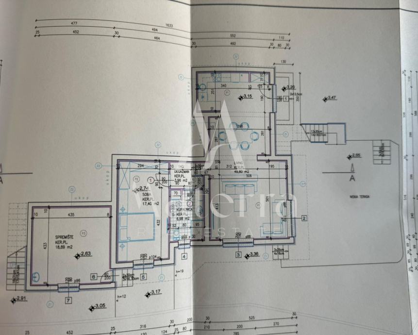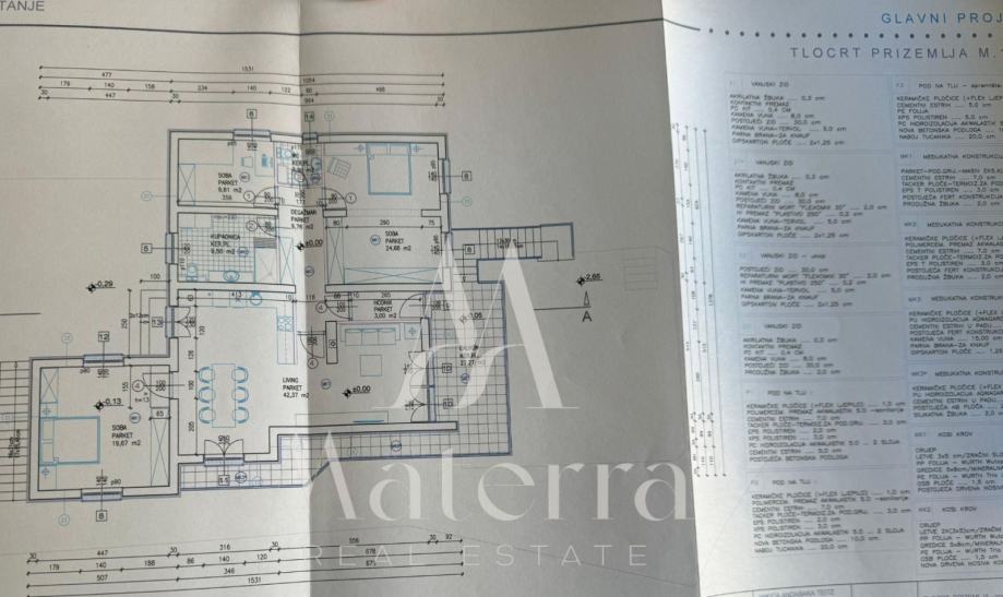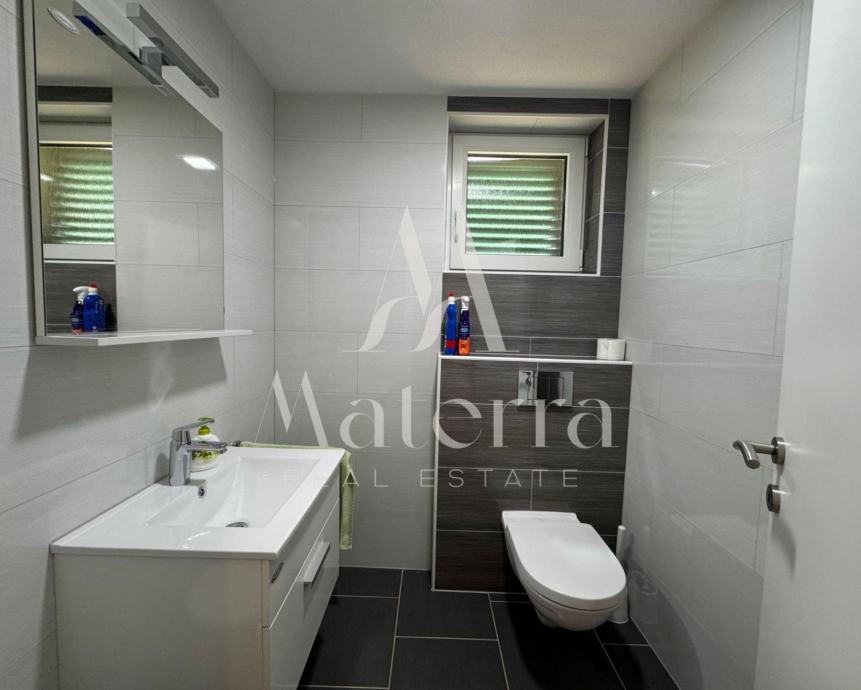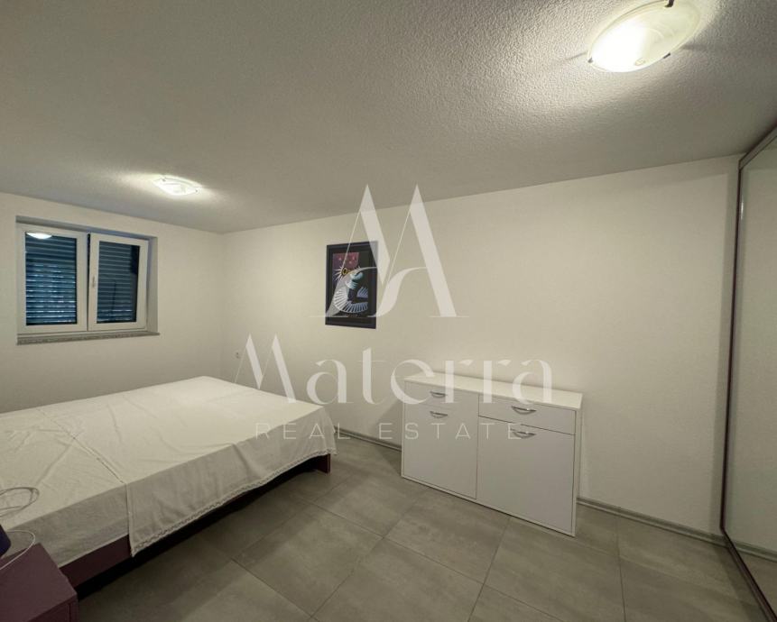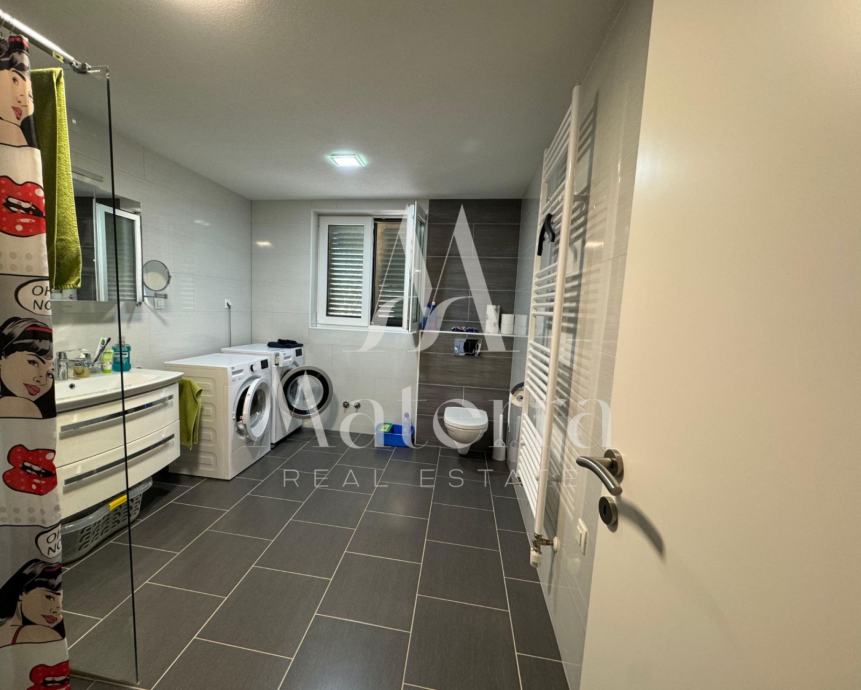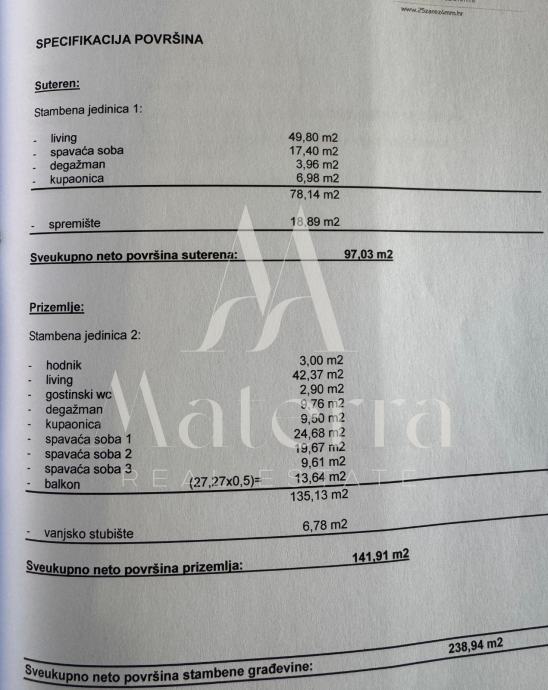 SUTEREN/PRIZEMLJE: stan površine 78,14m2, sastoji se od potpuno opremljene kuhinje sa blagovaonom, veliki dnevni boravak, cijeli prostor je otvorenog tlocrta i površine od gotovo 50m2. Stan ima jednu prostranu spavaću sobu P=17,40m2 i kupaonicu P=6,98m2. Uz stan se nalazi spremište P=18,89m2 u kojemu se nalazi postrojenje za podno grijanje koje je postavljeno kompletno za oba stana.