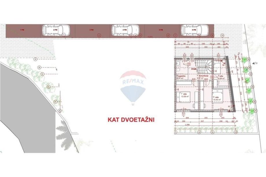U zgradi se nalaze tri stana svaki sa zasebnim ulazom jedan dvosobni se nalazi u prizemlju, jedan dvosobni na katu i naj veći trosobni je dvo- etažni sa pripadajućom terasom preko cijele zgrade. Svakom stanu pripadaju dva parkirna mjesta i dio okućnice, vrta prema prikazanoj slici i približno izračunatoj kvadraturi.
