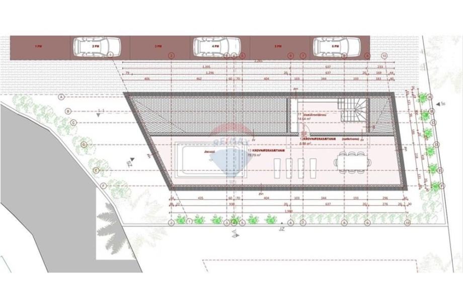 Iz predsoblja stubište vodi na spektakularnu krovnu terasu ukupne površine 100 m². Na krovnoj terasi nalaze se ljetna kuhinja, prostor za opuštanje, jacuzzi i sunčalište. Dio terase prekriven je pergolom, pružajući savršenu kombinaciju hlada i sunca za cjelodnevni užitak. Stanu pripada i vrt od 121m2 i dva parkirna mjesta.