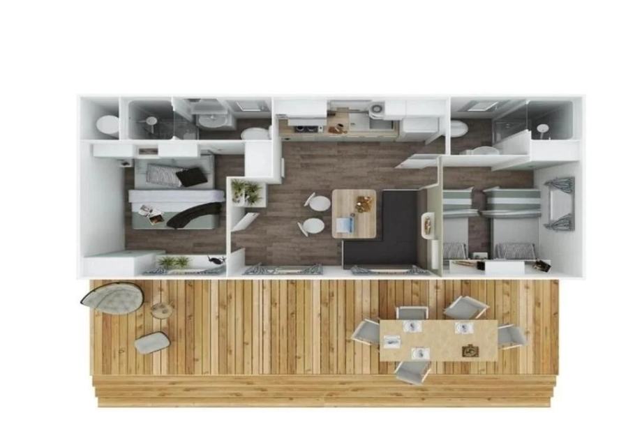 Tri mobilne kucica sa po dvije sobe i dvije kupaonice, dnevnim boravkom i terasama.