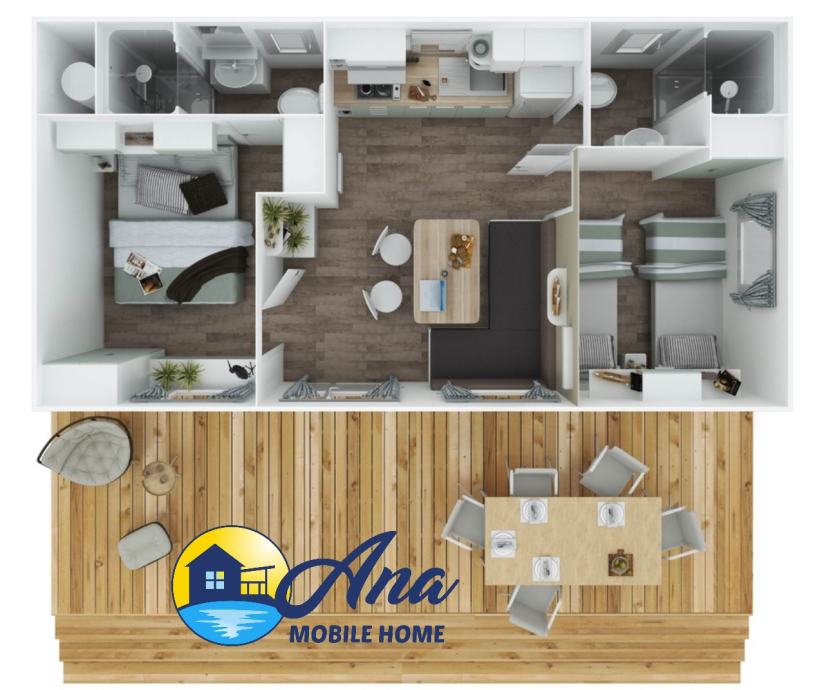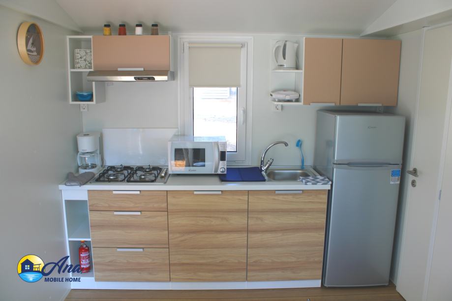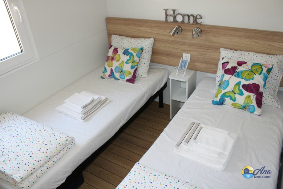 Sastoji se od; kuhinje, dnevne sobe, 2 spavaće sobe, 2 kupaonice i velike prostrane terase. Jedna spavaća soba ima bračni krevet dok je druga soba dvokrevetna s popratnim ormarima. U dnevnom boravku se nalazi još 1 funkcionalni krevet na razvlačenje (razvučen dimenzija bračnog kreveta) pojačan s velikim dormeo madmadracem i svim tekstilnim zaštitama kreveta I nadmadraca. Kućica može primiti ukupno 6 osoba istovremeno.