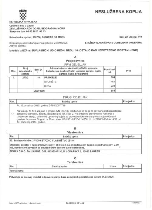 U prilogu je vlasnički list: Nekretnina je upisana u ZK uložak: 719, K.O.: Biograd n/m, kat. čestica: 277/2.