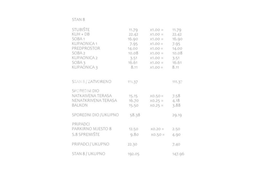 Dvoetažni apartman S8 na prvom i drugom katu objekta ukupne neto korisne površine od 148 m2 sastoji se od ulaznog stubišta površine 12 m2, predprostora površine 14 m2, dnevnog prostora površine 22 m2 (kuhinja, blagovaonica i dnevni boravak), tri spavaće sobe površina 17 m2 odnosno 16 m2 i 10 m2, tri kupaonice površine 8 m2 odnosno 3,5 m2 i 8 m2, natkrivene terase površine 15 m2, nenatkrivene terase površine 17 m2 i balkona površine 15 m2.Apartman je orijentacije istok - jug - zapad.U skrivenom dragulju sjeverne Dalmacije, mjestu Pakoštane smještenom u samom središtu Jadranske obale, jedinstvenog položaja između obale i Vranskog jezera gradi se objekt s 9 apartmana na pješačkoj udaljenosti od plaže od 250 m. Zahvaljujući izoliranoj poziciji unutar zelenog pojasa lokacija objekata pruža izuzetan mir.Svi apartmani će biti opremljeni klima uređajima u spavaćim sobama i dnevnom prostoru. U kupaonicama će biti postavljeno podno grijanje a podne obloge će biti od laminat parketa ili keramičkih pločica. Stakla će biti troslojna, a vanjska izolacija će biti od 10 cm stiropora.Svi apartmani će imati osigurano parking mjesto, ostavu i zajednički bazen.Način plaćanja je 50 % prilikom potpisa predugovora, a ostatak u fazama radova.Predviđeni završetak objekta je u 12. mjesecu 2025. godine a useljenje do 5. mjeseca 2026. godine.Malo o lokaciji: Pakoštane na zapadu graniče s mjestom Biograd na moru a okružuju ga četiri nacionalna parka (Kornati, Krka, Paklenica i Plitvička jezera) i dva parka prirode (Telašćica i Vransko Jezero).Prva spominjanja mjesta Pakoštane datiraju iz 15 stoljeća, dok se u rimsko doba na mjestu današnjih Pakoštana nalazila luka rimskog grada Asseriae zbog čega mjesto obiluje povijesnim ostacima iz Rimskog doba. Osim samog mjesta, i u okolici Pakoštana se nalaze mjesta povijesnog značenja zbog čega je ovaj kraj izuzetno zahvalan za ljubitelje povijesnih znamenitosti.U samom mjestu se nalaze prekrasne plaže, a u akvatoriju mjesta se nalazi 5 malih otočića zbog čega je ovo mjesto zahvalno za ljubitelje brodskih izleta.Ako želite osjetiti izvorni duh dalmatinskog mjesta a istovremeno ste pustolov željan istraživanja ljepota prirode i bogate prošlosti, Pakoštane su pravi izbor za Vas.Dodatne informacije - udaljenosti od važnijih lokacija:More: 250 m / Plaža: 250 m / Zadar 33 km / Zračna luka 27 kmKupovina: 1000 m / restoran: 650 m / ljekarna 1000 m / centar mjesta 1000 mZa sve ostale informacije stojimo Vam na raspolaganju....