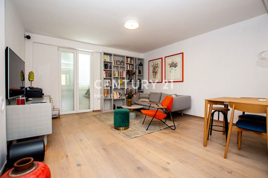 Stan je jugozapadne orijentacije, što mu omogućuje obilje prirodnog svjetla tijekom cijelog dana i čini ga izuzetno sunčanim prostorom. Sastoji se od dvije spavaće sobe, a dodatnu funkcionalnost pružaju balkon, podrum te ostava/skladište. Na raspolaganju je i parkiralište, što je dodatna pogodnost za buduće vlasnike.