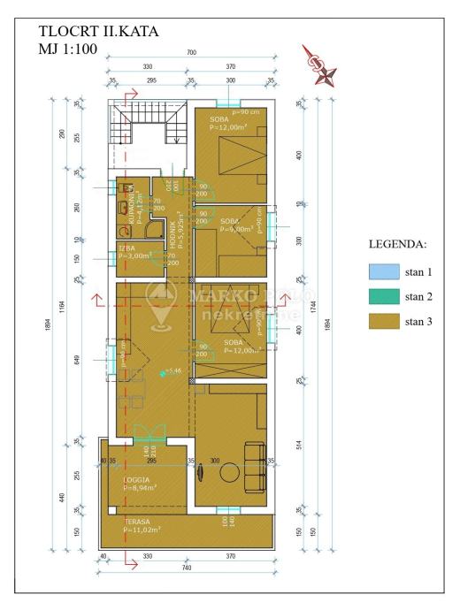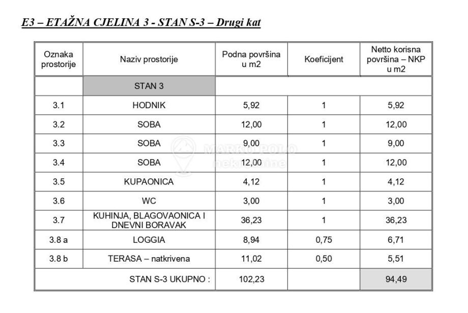 - Sastoji se od: Hodnika, kupaonice, kuhinje i prostranog dnevnog boravka, tri sobe, WC-a, loggie i natkrivenog balkona