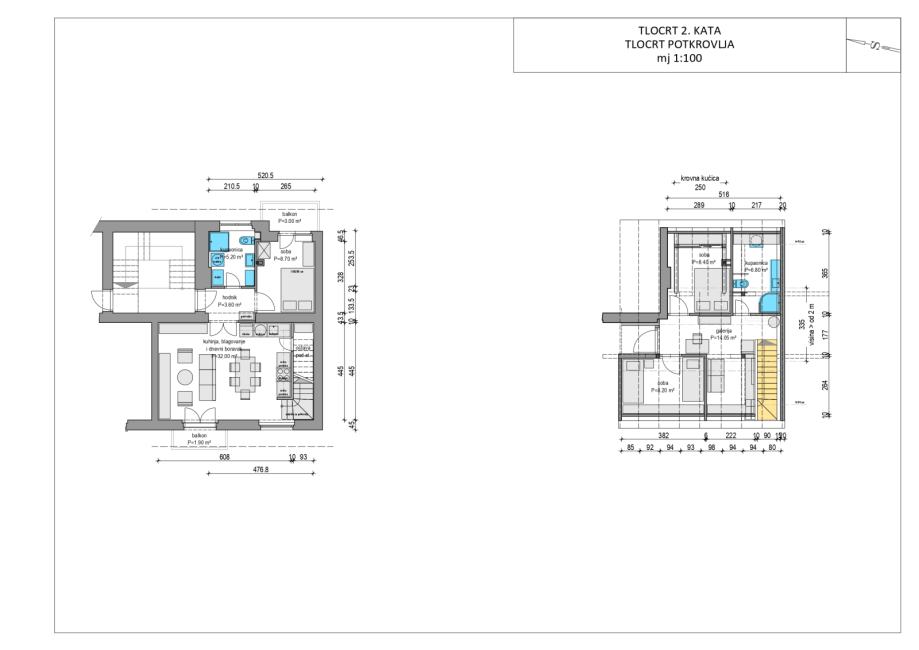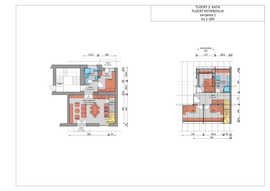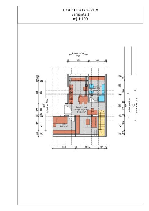 donja etaža je stan površine 50 m2 (za potpuno uređenje), gornja etaža je tavanski/potkrovni prostor iznad stana površine 50 m2 (buduća neto površina 38 m2), trenutno u roh bau stanju. Dobra visina u sljemenu.