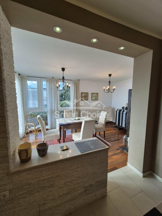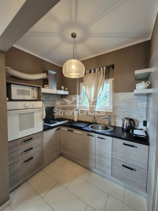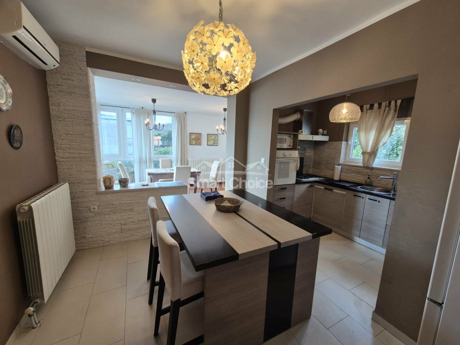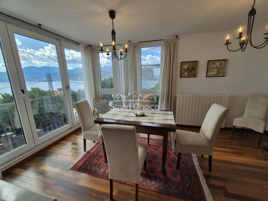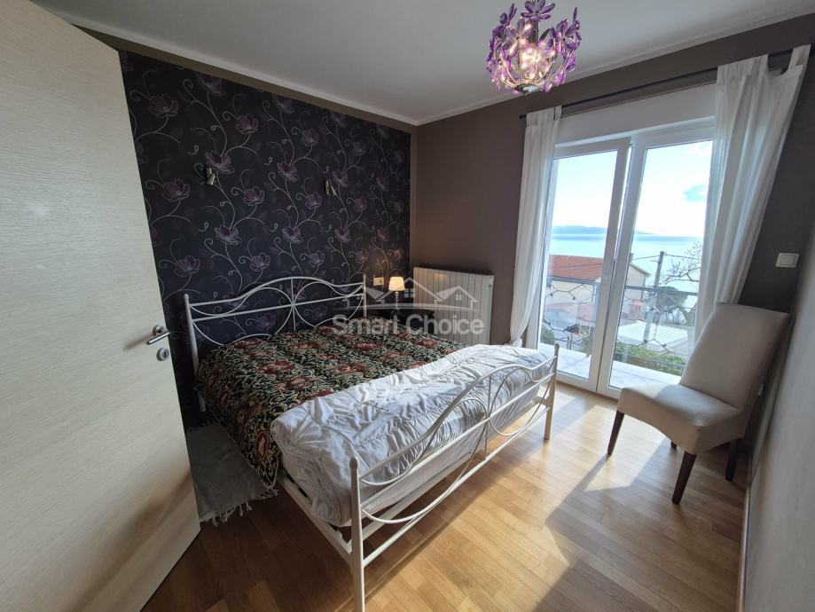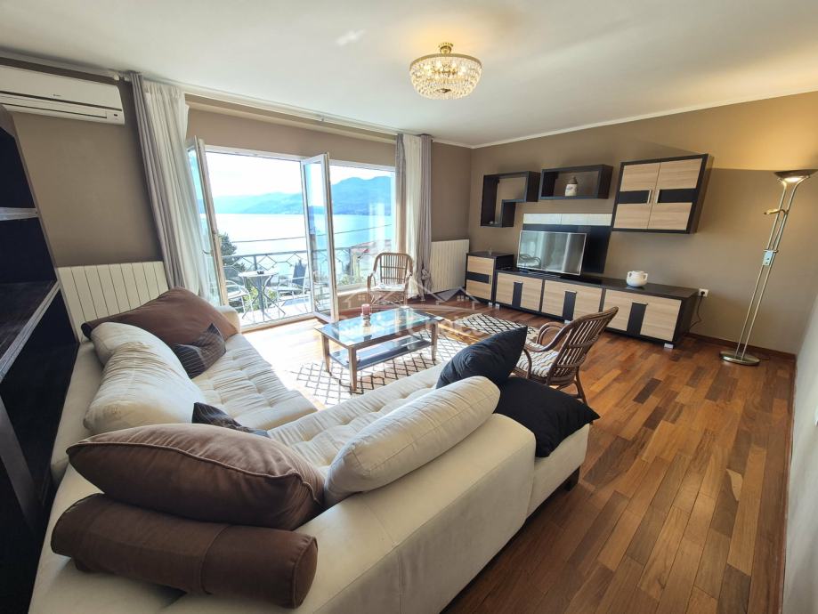 Bivio- etaža na prekrasnoj lokaciji blizu mora i plaža (2.red) s prekrasnim pogledom. Sastoji se od velikog dnevnog boravka, kuhinje s blagovaonom, 2 spavaće sobe, radne sobe kupaone i balkona. Stanu pripada jedno parkirno mjesto.