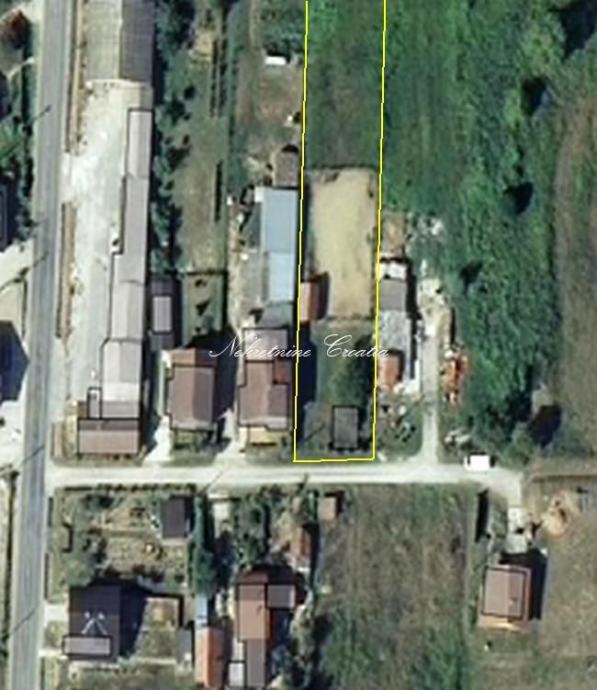 Građevinsko zemljište površine 1.311 m2, sa dozvolom za gradnju obiteljske kuće i ucrtanim, dodatnim stambenim objektom (srušenim) tlocrtne površine 40 m2.Zemljište je ravno, pravilnog, pravokutnog oblika, širine uz asfaltiranu cestu 16 m, dužine 82 m.