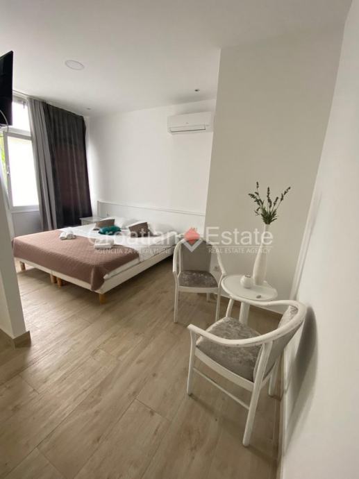 Iznajmljujemo uređeni poslovni prostor smješten na frekventnoj lokaciji u blizini bolnice. Smješten je na dvije etaže, gornja etaža u prizemlju je površine 180 m2 (5 soba sa kupatilima), a donja etaža u podrumu/suterenu je površine 97,88 m2 (kuhinja, sanitarni čvorovi, ostava)