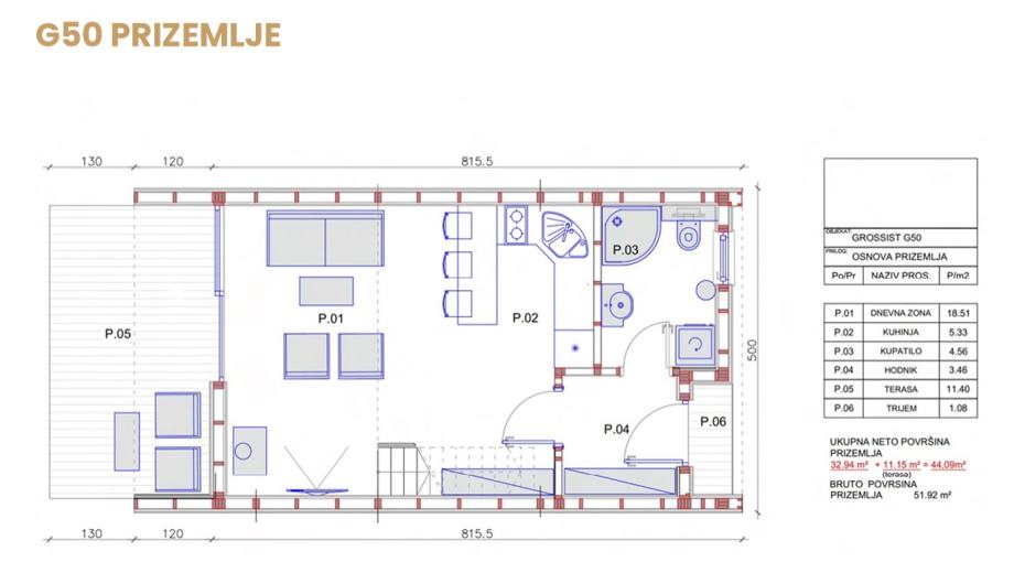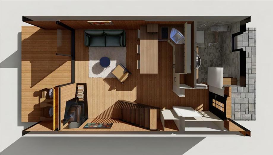 Etaža prizemlja ima unutrašnju površinu od 32,94m2, a sastoji se od kuhinje sa dnevnim boravkom, kupaonice i dodatne prostorije (koja može služiti kao manja soba ili ostava). Vanjska terasa ima površinu od 11.40m2.