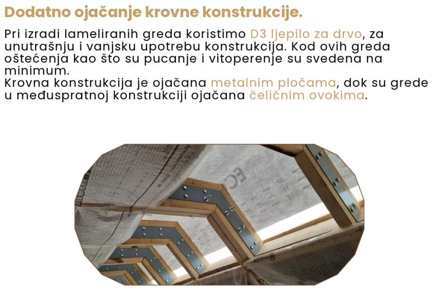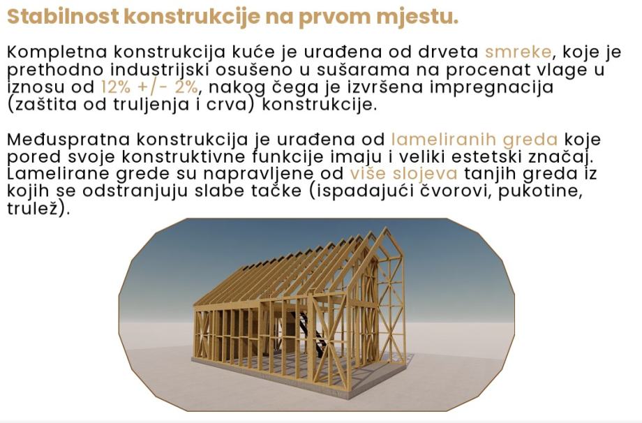 Kompletna konstrukcija kuće je izvedena od drveta smreke koje je prethodno industrijski osušeno u sušarama na postotak vlage od 12% +/- 2%, nakog čega je izvršena impregnacija konstrukcije (zaštita od truljenja i crva). Međukatna konstrukcija je izvedena od lameliranih greda koje pored svoje konstruktivne funkcije imaju i veliki estetski značaj. Lamelirane grede su napravljene od više slojeva tanjih greda iz kojih se odstranjuju slabe točke (ispadajući čvorovi, pukotine, trulež).