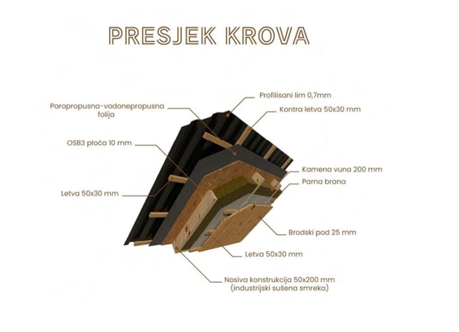 U drvenim zidovima se nalazi 150mm, a u krovu 200mm kamene vune, koja se pored svoje odlične termo i zvučne izolacije odlikuje i visokim stupnjem otpornosti na požare i spada u ekološki prihvatljive materijale.