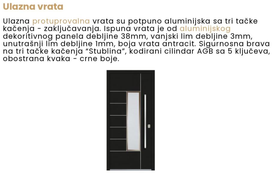 Ulazna protuprovalna vrata su potpuno aluminijska sa tri točke zaključavanja. Ispuna vrata je od aluminijskog dekorativnog panela debljine 38mm, vanjski lim debljine 3mm, unutrašnji lim debljine 1mm, boja vrata antracit. Sigurnosna brava na tri točke zaključavanja “Stublina”, kodirani cilindar AGB sa 5 ključeva, obostrana kvaka - crne boje.