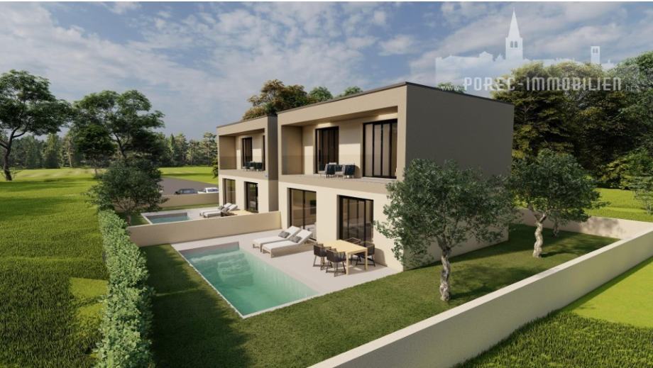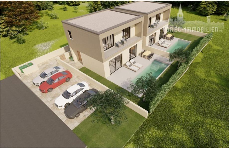 U mirnom predgrađu Poreča, svega 200 metara od trgovine, restorana i ostalih sadržaja potrebnih za svakodnevni život, u prodaji je moderna dvojna kuća s bazenom koja je trenutno u fazi izgradnje.