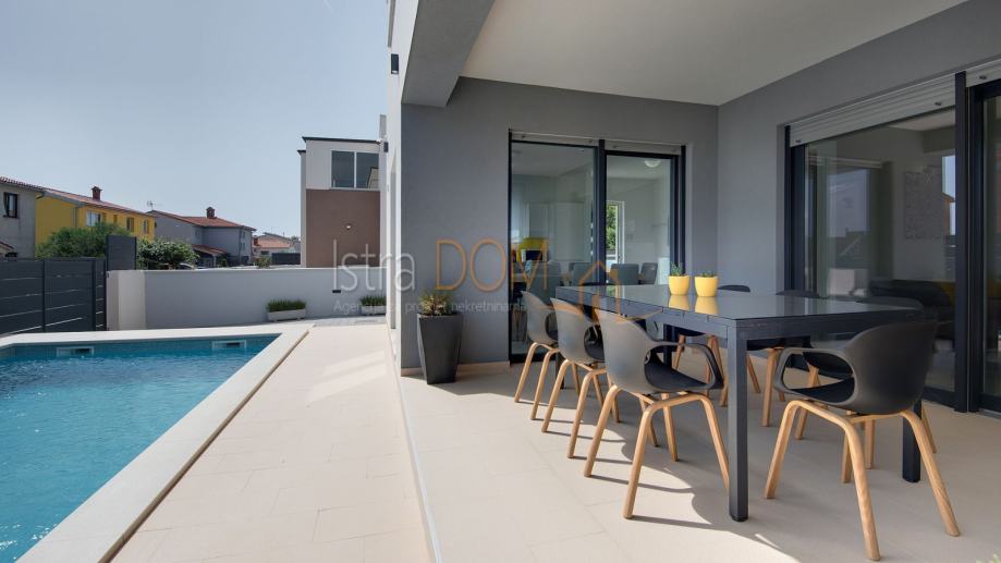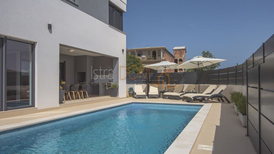 Prodajemo prekrasnu vilu na dvije etaže s bazenom, smještenu nedaleko od Pule. Ova moderna vila nudi 172 m² stambenog prostora na okućnici od 388 m², idealna za obitelj ili kao investicija za najam.