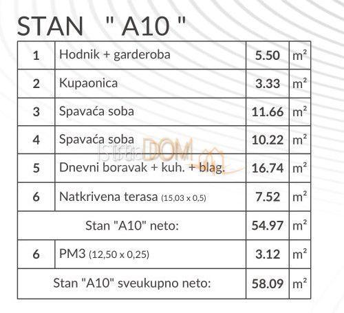 Prodaje se stan u izgradnji koji se nalazi na 1 katu i sastoji se od ulaznog hodnika, dvije spavaće sobe, kuhinje sa dnevnim boravkom, kupatila, terase, parkirnog mjesta PM4 i PM16 .