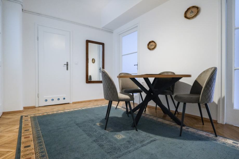 Stan ima površinu od 78m2, visoke stropove i velike prostorije koje stvaraju osjećaj prostranosti i udobnosti. Sastoji se od dvije velike sobe jednakih dimenzija, manja “djevojačka” soba idealna za radnu sobu, dok se mala zatvorena loggia može koristiti kao radni prostor, predsoblja u kojem je blagovaonski stol, kuhinje, balkona, kupaonice i odvojenog toaleta.