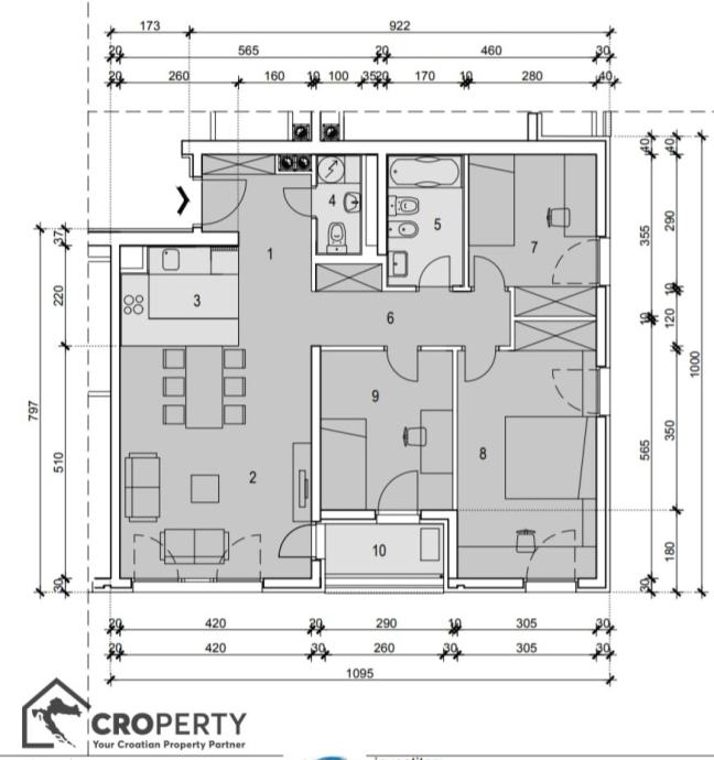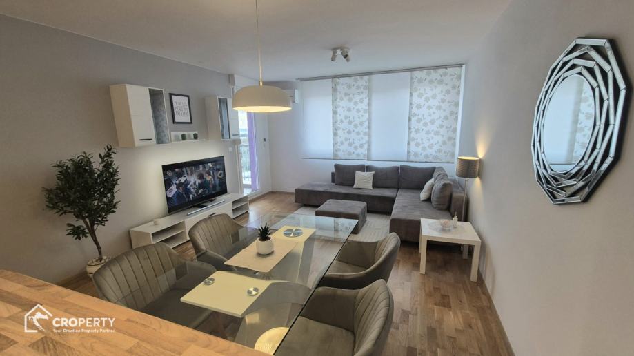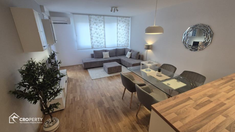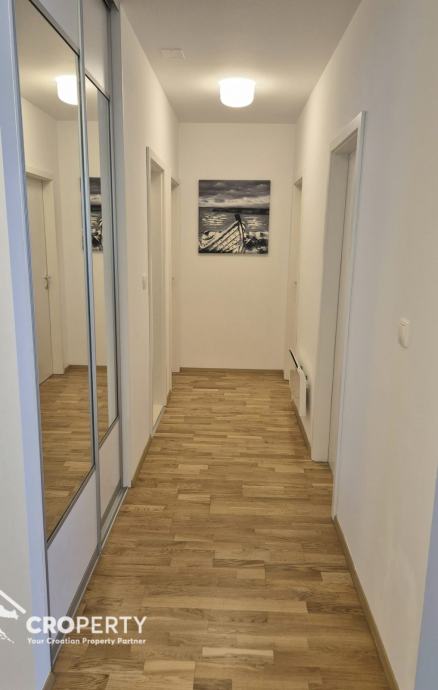 Posredujemo u DUGOROČNOM najmu komfornog, potpuno novouređenog i moderno namještenog trosobnog stana sa spremom i dva garažna parking mjesta bruto površine 121m², a neto površina 106m2 (vidi tlocrt). Stan se nalazi na 5. katu zgrade novije gradnje s dva lifta.