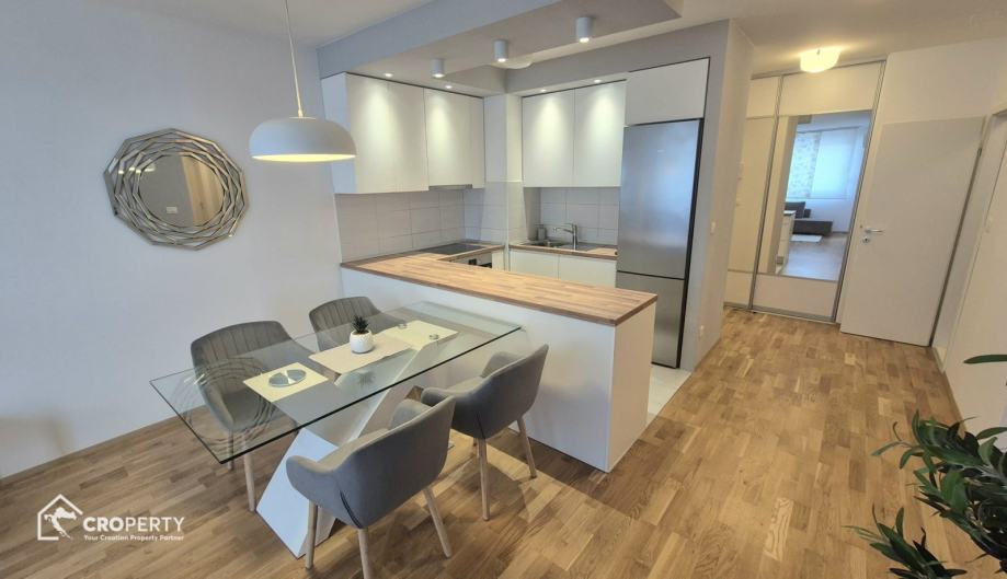The apartment is situated in a quiet yet well-connected part of Kila – just a few steps from all essential amenities: shops, pharmacies, bus stop, and two shopping centers.
