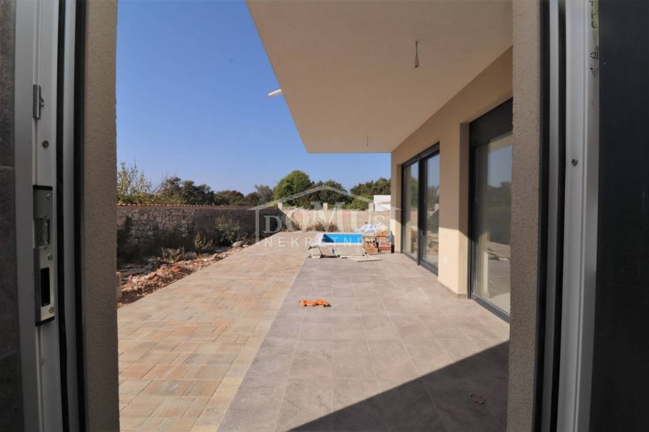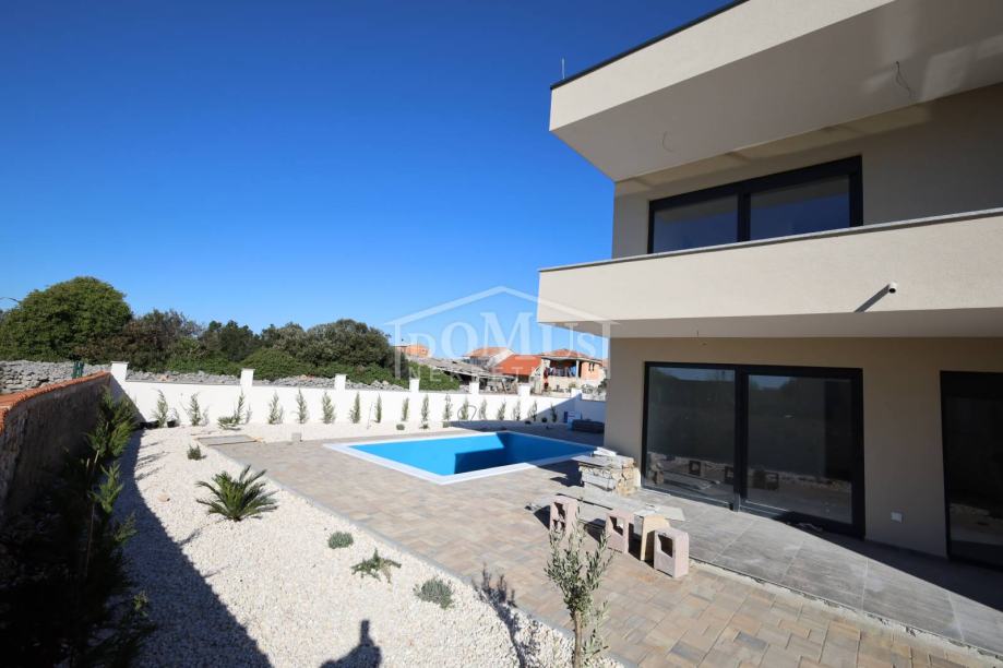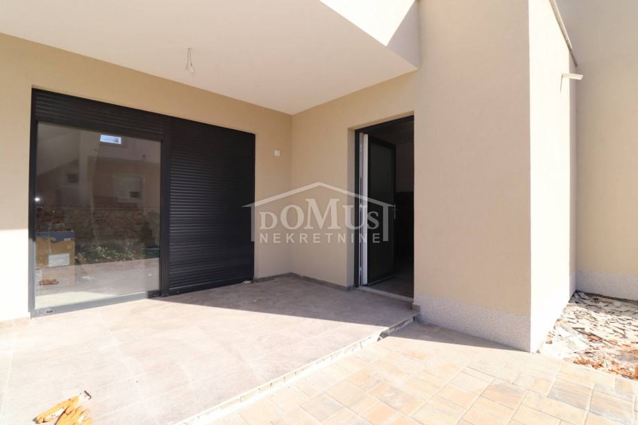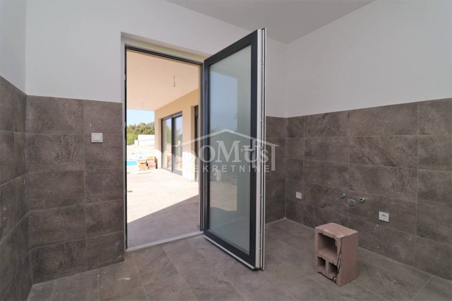 Prekrasna obiteljska kuća moderne arhitekture i vrlo funkcionalnog rasporeda u Bogdanovićima, na mirnoj lokaciji, udaljen 4,5m od šljunčane plaže na Jadriji. Kuća je dvojni objekt, (zapadna strana) na dvije etaže: Prizemlje + 1.kat sa 132,45m2 sveukupne korisne površine te 250m2 okućnice sa vanjskim bazenom od 24m2 te prostranim parkirnim prostorom. Prizemlje ima predsoblje, prostrani dnevni boravak, kuhinju i blagovaonicu, spavaća soba, spremište, kupaonicu, veliku terasu u sklopu koje je smještena ljetna kuhinja te bazen. Na 1. katu su smještene tri spavaće sobe, dvije kupaonice. Kuća se gradi modernim i kvalitetnim materijalima kao što je: termo fasada 10 cm, stolarija antracit boje sa električnim podizačima roleta i komarnicima, u kupaonicama moderna sanitarija, podno grijanje na struju u svim kupaonicama u prizemlju i na katu, sve spavaće sobe i dnevni boravak su opremljeni sa klima uređajima.
