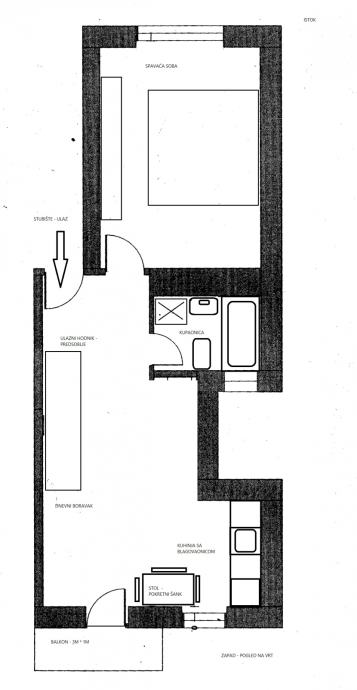 Stan se sastoji od ulaznog prostora iz kojeg se prilazi svim prostorijama - boravak sa kuhinjom i blagovaonicom (30m2), spavaća soba (19m2), kupaonica sa wc-om (4m2). Stanu pripada i malo spremište u podrumu zgrade od cca 5m2.