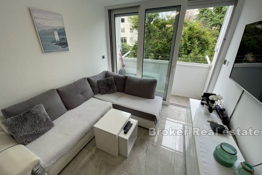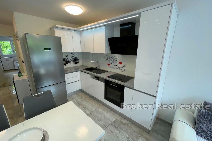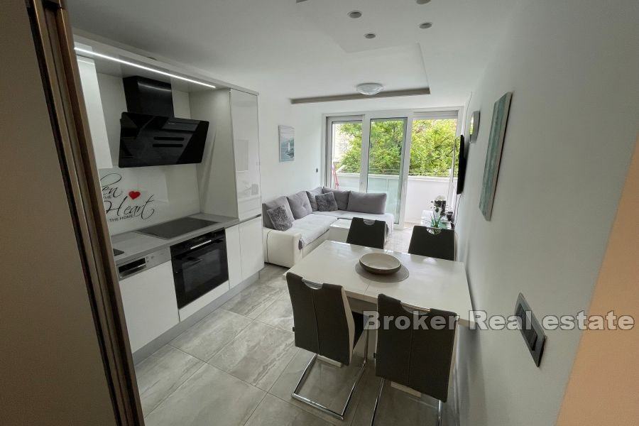 Stan se sastoji od kompletno opremljene kuhinje sa svim aparatima, blagovaone i dnevnog boravka koji se nalaze na jugu, te komforne dvije spavaće sobe na sjeveru, hodnika, kupatila te malog balkona.