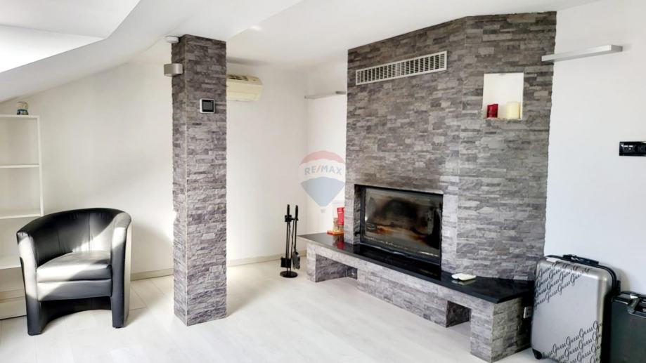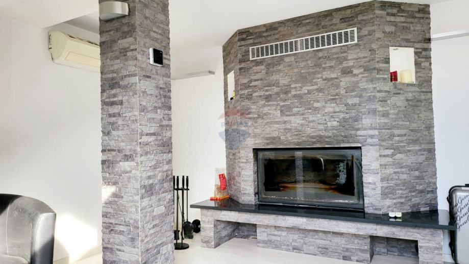 U prostranom dnevnom boravku nalazi se kamin što dodatno naglašava luksuz i udobnost interijera.