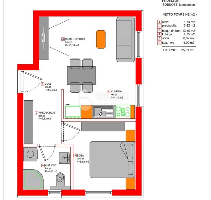 Unutarnji prostor stana zauzima korisnu površinu od 35,63 m2.