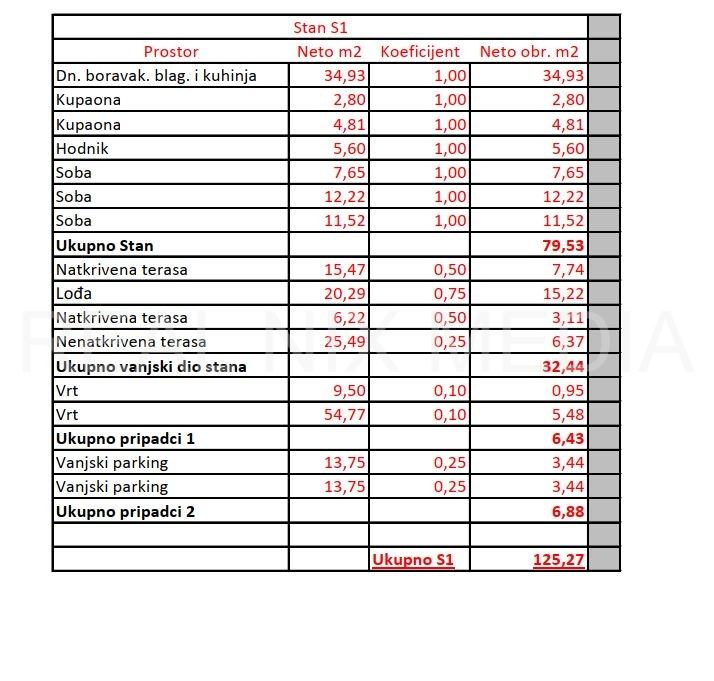 STAN oznake S1 nalazi se u prizemlju zgrade i sastoji se od 3 komforne spavaće sobe, 2 kupaonice, prostranog dnevnog boravka sa kuhinjom i blagovaonicom, te hodnika. Uz stan dolazi velika natkrivena i djemočno nenetkrivena terasa od nevjerovatnih 67,5 m2 koja osigurava budućim stanarima predivan prostor za druženje i uživanje. Stan je okružen vrtom od 55 m2 , te mu još pripadaju 2 vanjska parkirna mjesta.