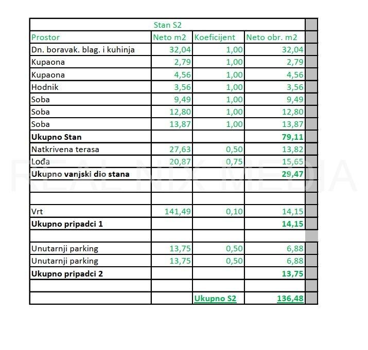 STAN oznake S2 nalazi se u prizemlju zgrade i sastoji se od 3 komforne spavaće sobe, 2 kupaonice, prostranog dnevnog boravka sa kuhinjom i blagovaonicom, te hodnika. Uz stan dolazi velika natkrivena terasa od 27,63 m2 koja osigurava budućim stanarima predivan prostor za druženje i uzivanje. Stan je okružen vrtom od 141,49 m2, te mu još pripadaju 2 garažna parkirna mjesta.