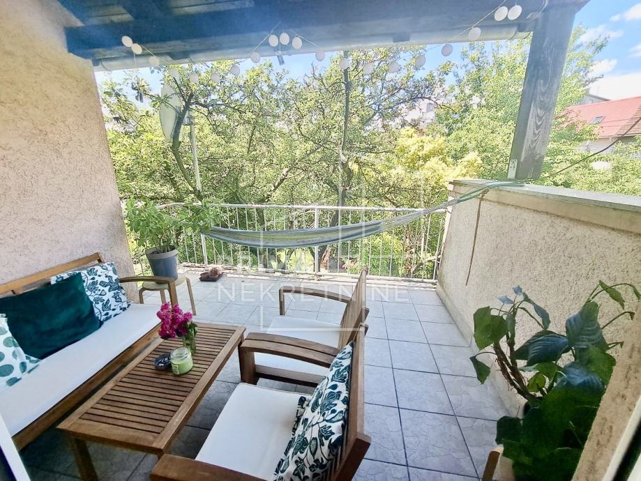 Na katu su dvije spavaće sobe, kupaonica s toaletom i veliki dnevni boravak s izlazom na balkon.