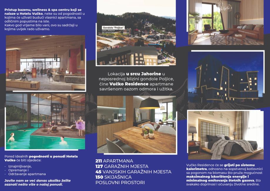 Vučko Residence, poslovno-stambeni kompleks od 12 etaža, nalazi se neposredno uz Aparthotel Vučko s kojim je direktno povezan toplinskom vezom. Budući vlasnici apartmana moći će koristiti bazen, wellness i spa centar koji se nalaze u Hotelu Vučko.