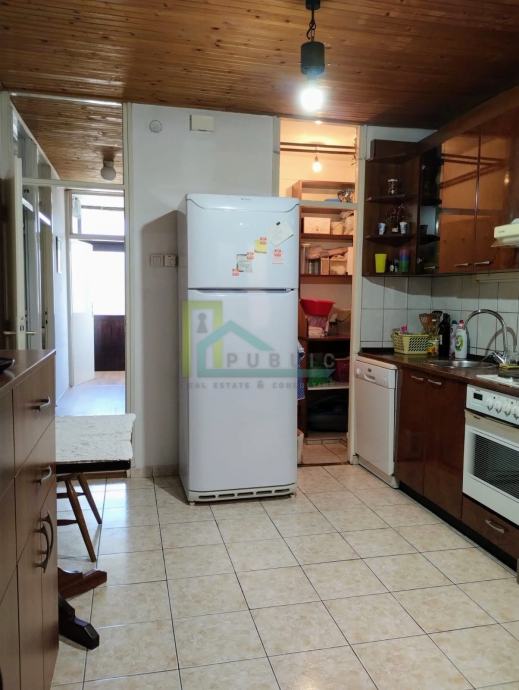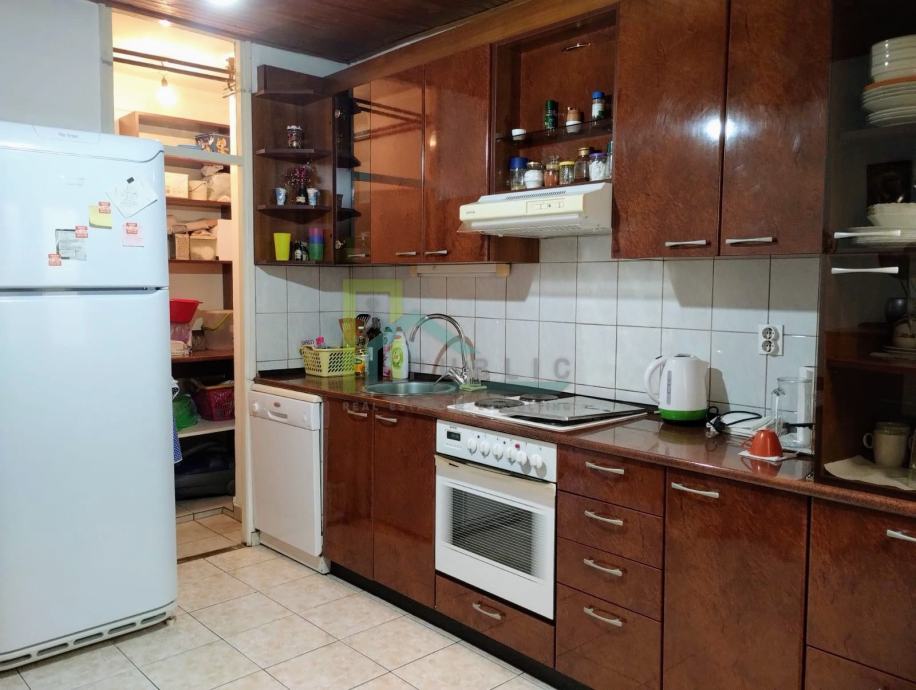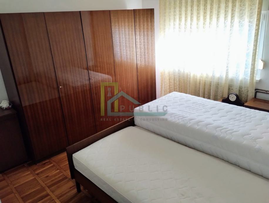 Neto površina stana je 88 m2 i čine je pretprostor, vešeraj, kupaonica (s tuš kabinom i bideom), 2 velike spavaće sobe (14 i 17 m2), kuhinja + ostava (12 m2), veliki dnevni boravak i blagovaonica te mala radna soba (nastala pregradom unutar dnevnog boravka ukupne kvadrature 30 m2). Odmah ispred ulaza u stan su 2 vanjska parkirna mjesta ukupne površine 32 m2, a iza stana se nalazi vrt od 53 m2 unutar kojeg su zidano spremište od 7,5 m2 (s terasom iznad spremišta) i zidana ljetna kuhinjica od 2 m2. Stan ima centralno plinsko grijanje te split klima uređaj za dnevni boravak i blagovaonicu. Orijentacija stana: sjever, istok i jug. Stan se iznajmljuje potpuno namješten i opremljen. Djelomična adaptacija 2020., poglavito podova, parketa i pločica i stolarije. Režije niske, ukupno mjesečni prosjek 120€. Dugoročan najam, obavezan polog.