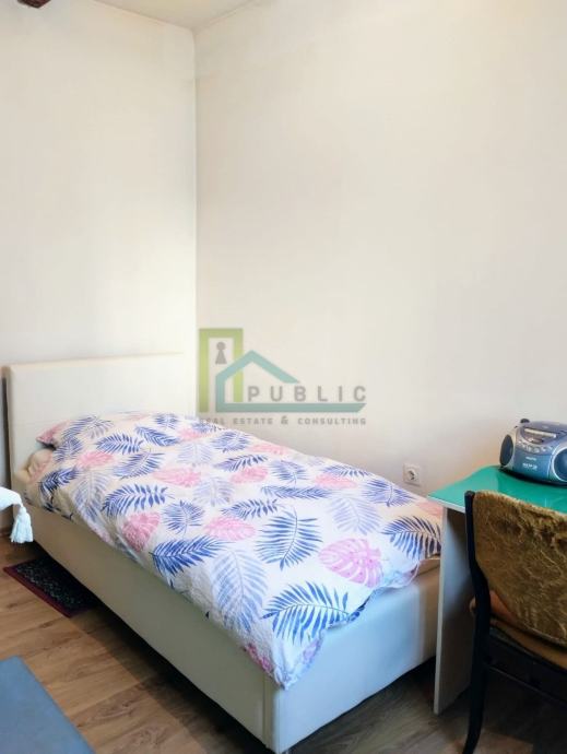 Neto površina stana je 88 m2 i čine je pretprostor, vešeraj, kupaonica (s tuš kabinom i bideom), 2 velike spavaće sobe (14 i 17 m2), kuhinja + ostava (12 m2), veliki dnevni boravak i blagovaonica te mala radna soba (nastala pregradom unutar dnevnog boravka ukupne kvadrature 30 m2). Odmah ispred ulaza u stan su 2 vanjska parkirna mjesta ukupne površine 32 m2, a iza stana se nalazi vrt od 53 m2 unutar kojeg su zidano spremište od 7,5 m2 (s terasom iznad spremišta) i zidana ljetna kuhinjica od 2 m2. Stan ima centralno plinsko grijanje te split klima uređaj za dnevni boravak i blagovaonicu. Orijentacija stana: sjever, istok i jug. Stan se iznajmljuje potpuno namješten i opremljen. Djelomična adaptacija 2020., poglavito podova, parketa i pločica i stolarije. Režije niske, ukupno mjesečni prosjek 120€. Dugoročan najam, obavezan polog.