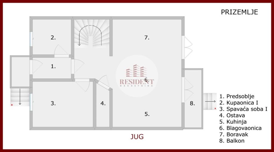 - prizemlja od 60 m2 u kojem se nalazi: predsoblje, kupaonica, spavaća soba, ostava, kuhinje, boravka, blagovaonice, terase sa izlaskom u dvorište i stubišta za 1. kat